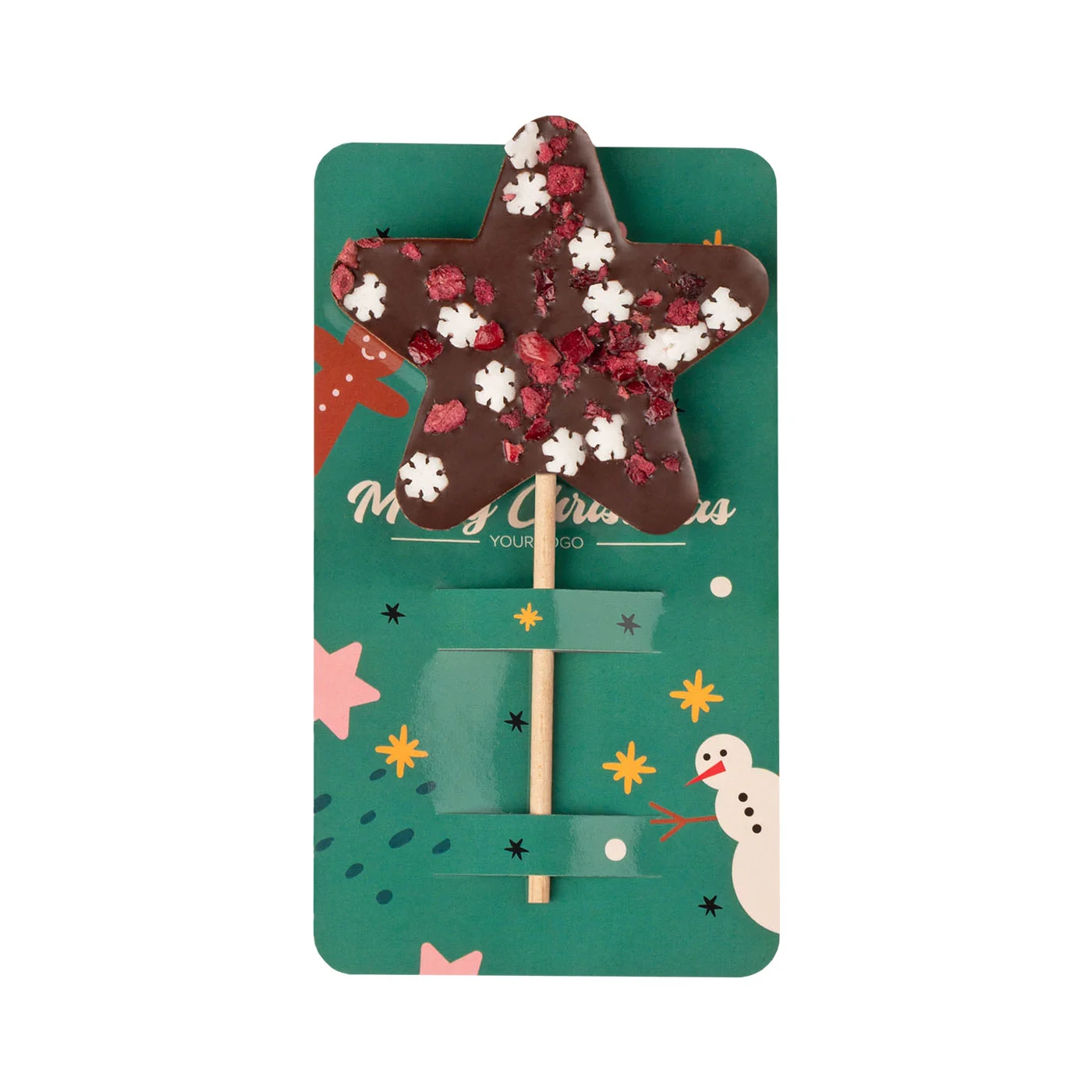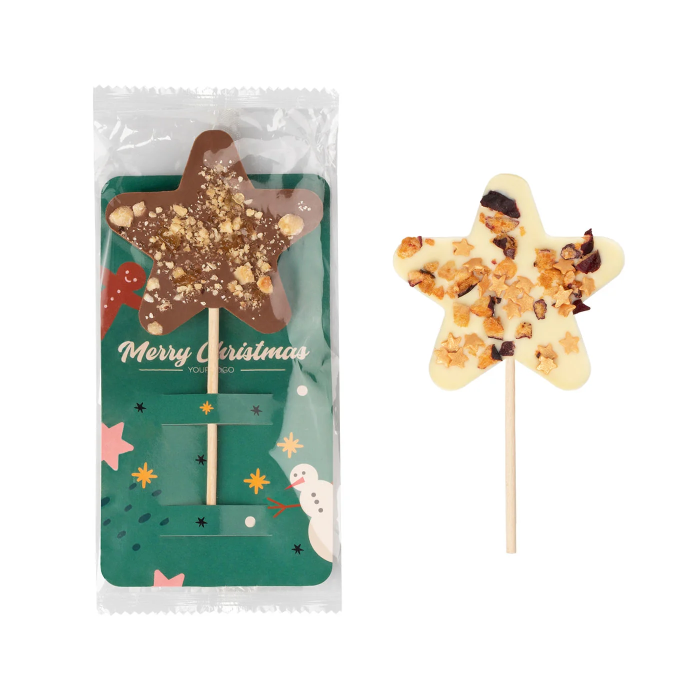 Lízatko z bielej, mliečnej alebo horkej čokolády na paličke, tvar hviezdička, stromček. doba dodania: 2-3 týždne od schválenia náhľadu trvanlivosť: 6 mesiacov možnosti tlače: etiketa na obale alebo výroba vlastnej formy.