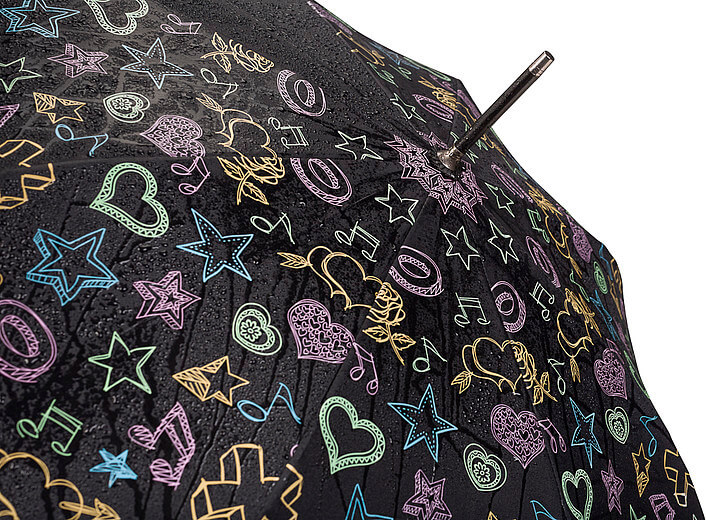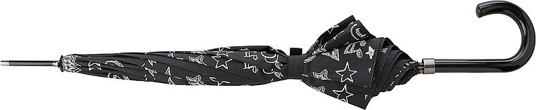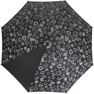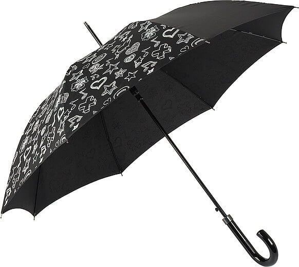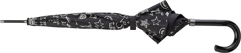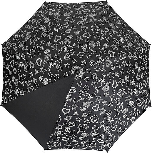 Automatický dáždnik (190T) s ôsmimi panelmi. Kovový driek a rám, laminátové rebrá a plastová rukoväť. Tlačidlo nad rukoväťou automaticky otvorí dáždnik. Biele znaky menia farbu, keď je materiál zvlhčený.