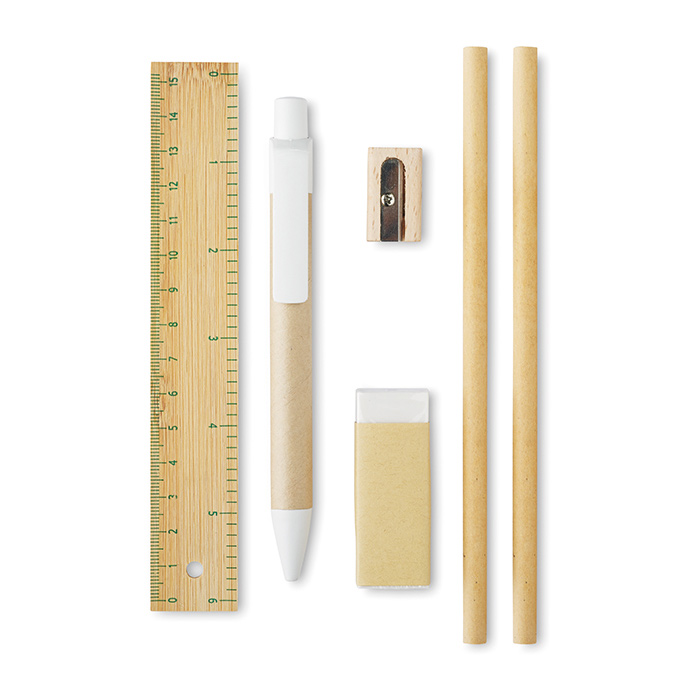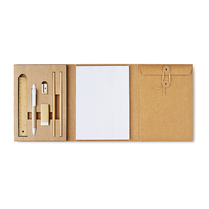 Sada kancelárskych potrieb. 8 kusov. Papier Memo Pad (40 listov), 2 ceruzky, pravítko, strúhadlo, guma, pero s modrým atramentom a praktický obal z recyklovaného papiera s vreckom na obálky. Ideálne použitie pre konferencie.