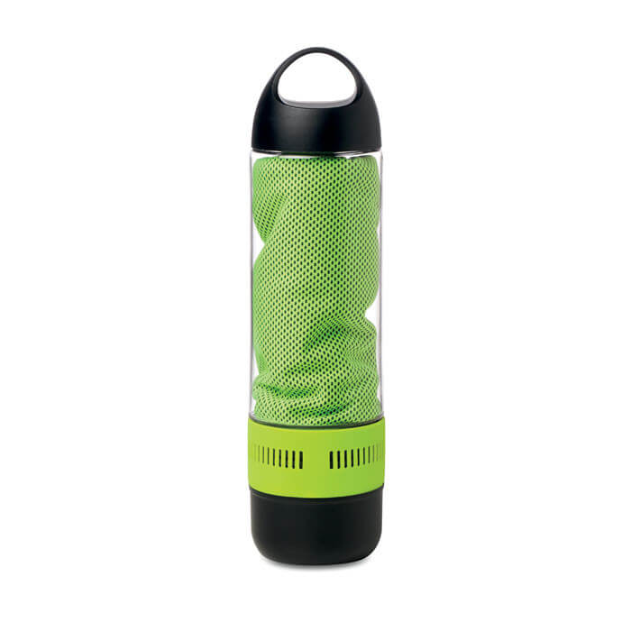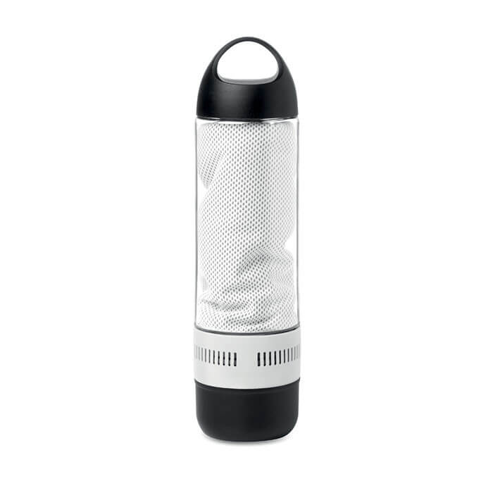 Bezdrôtový reproduktor - fľaša s objemom 500 ml. Obsahuje uterák z polyesteru s veľkosťou 30x80 cm. Nabíjacia Li-on 300mAh batéria priložená. Micro USB kábel priložený. Výstup: 3W.
