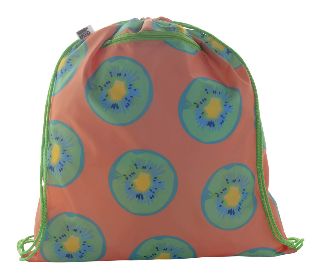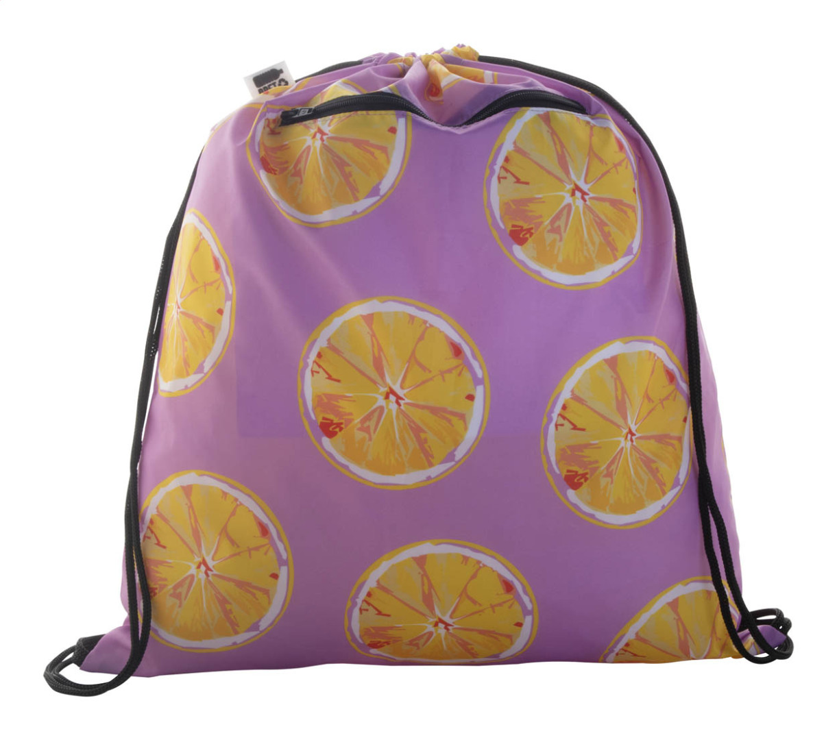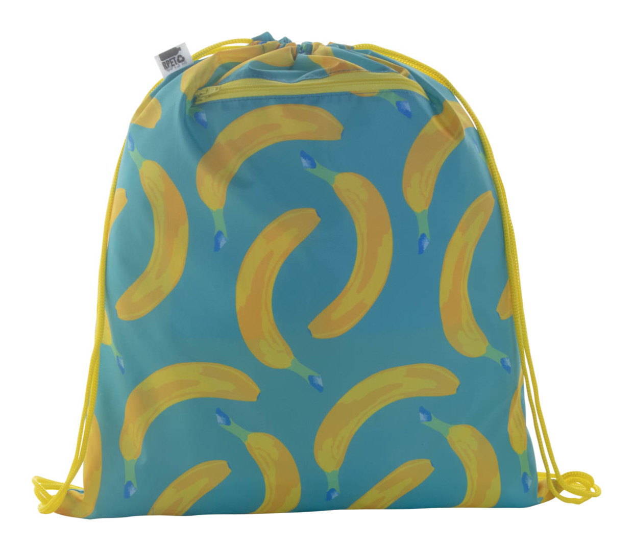 Vak na sťahovanie šnúrkou na zákazku s predným vreckom na zips, 190T RPET polyester, s etiketou s označením RPET. S celoplošne tlačenou grafikou sublimáciou. Cena zahŕňa sublimačnú potlač, nezahŕňa tlačovú prípravu. Min. mn .: 50 ks.