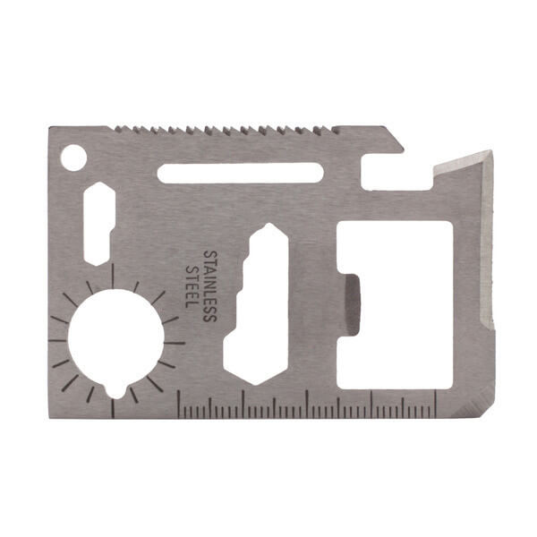Set náradia z ocele s 11 funkciami vo veľkosti kreditnej karty v puzdre z PU. Funkcie: otvárač na konzervy, nôž, plochý skrutkovač, meradlo, otvárač na fľaše, očkový kľúč (4 veľkosti), motýlikový kľúč, pílka, uhlomer, plochý kľúč (2 veľkosti) a očko na napínanie lanka.