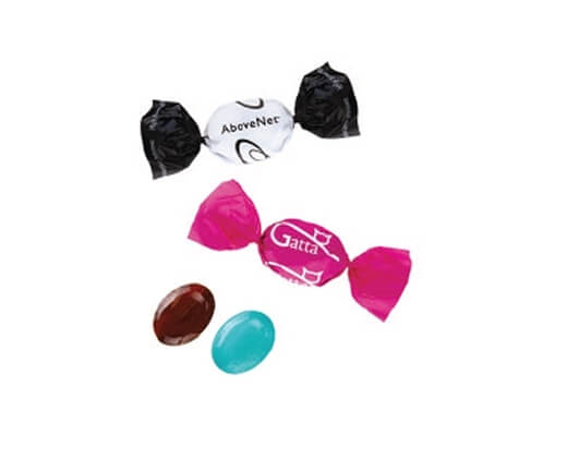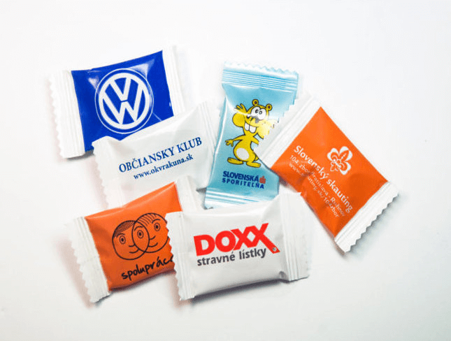 Cukríky s potlačou vlastného reklamného obalu máme v rôznych variantách a príchutiach, ako ovocné, mentolové, kyslé, vegan a iné. Cukríky majú hmotnosť od 3 g do 5g. Cukríky balíme do "mašličky" alebo ako "minisáčok". Minimálny odber cukríkov s potlačou s potlačou obalu je 5 kg. (1 kg = cca 310 ks cukríkov), záleží však od druhu. Špecialitou sú okrúhle roxorové cukríky, ktoré vieme potlačiť jednoduchým logom priamo na cukrík.