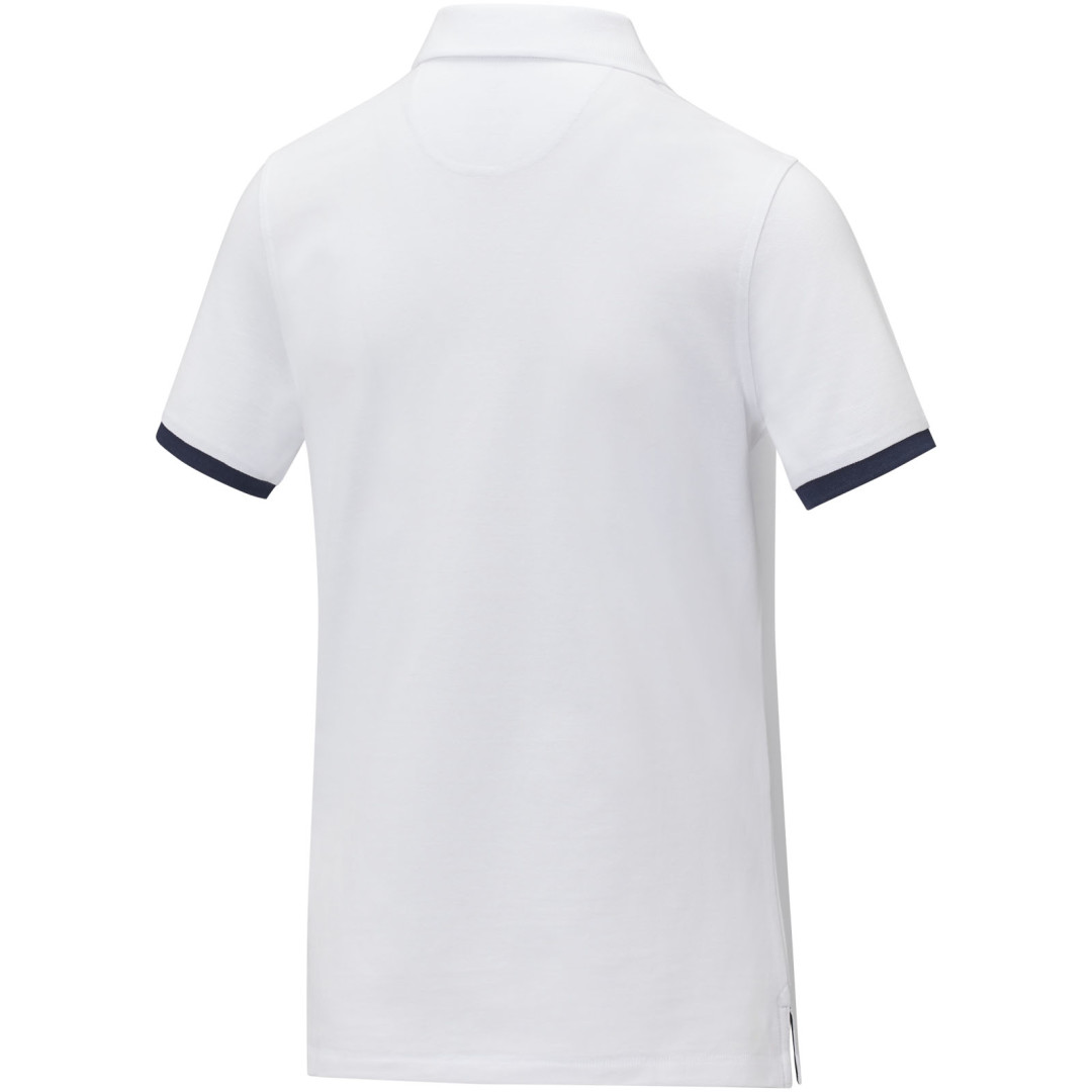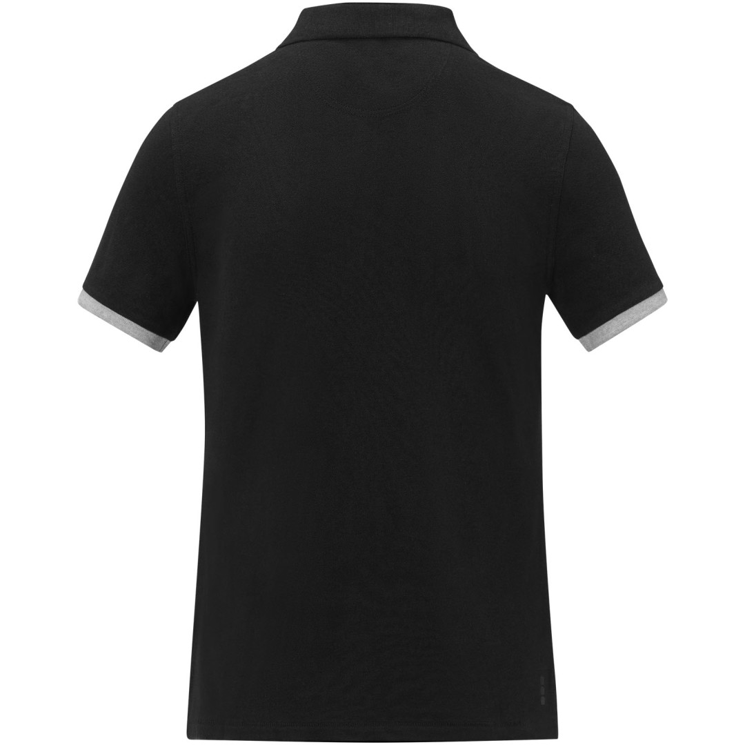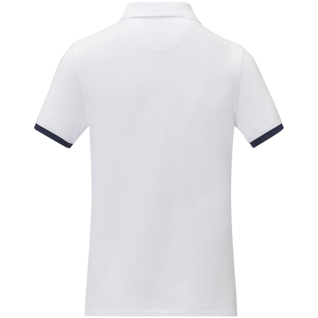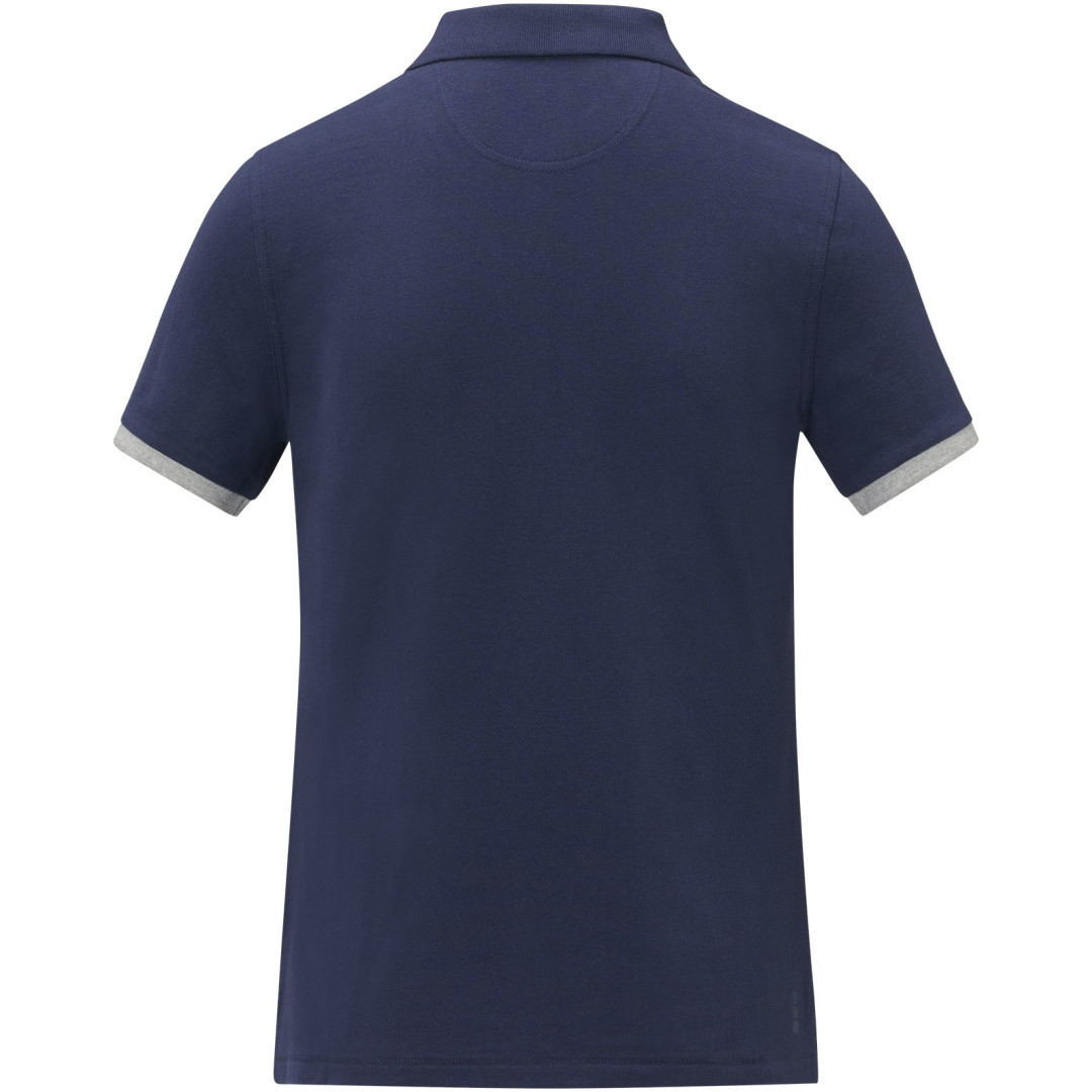 Plochý rebrovaný golier. Rebrovaný úplet manžiet. Kontrastný farebný vnútorný límec a rebrované manžety. Zapínanie na tri gombíky. Detaily s vyšívacím stehom. Saténová lemovka výstrihu. Bočné rázporky so saténovou lemovkou. Sedlo. Predsunutá spevňujúca lemovka výstrihu s retiazkovým švom. Gravírované gombíky v rovnakej farbe. Potlač štítku technológiou heat transfer pre väčšie pohodlie. 200 g/m2