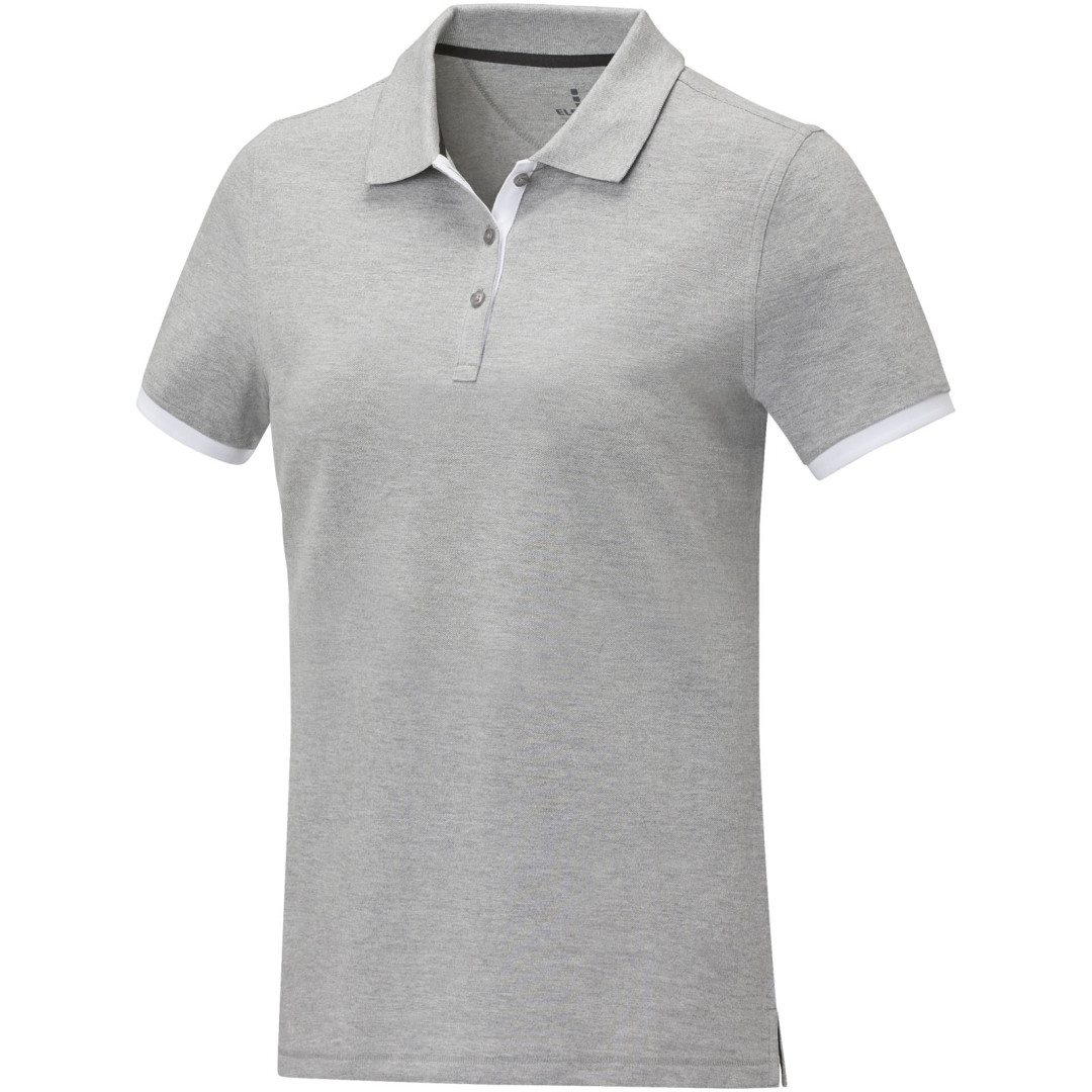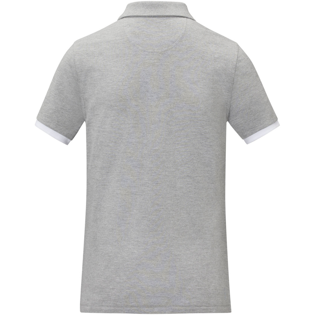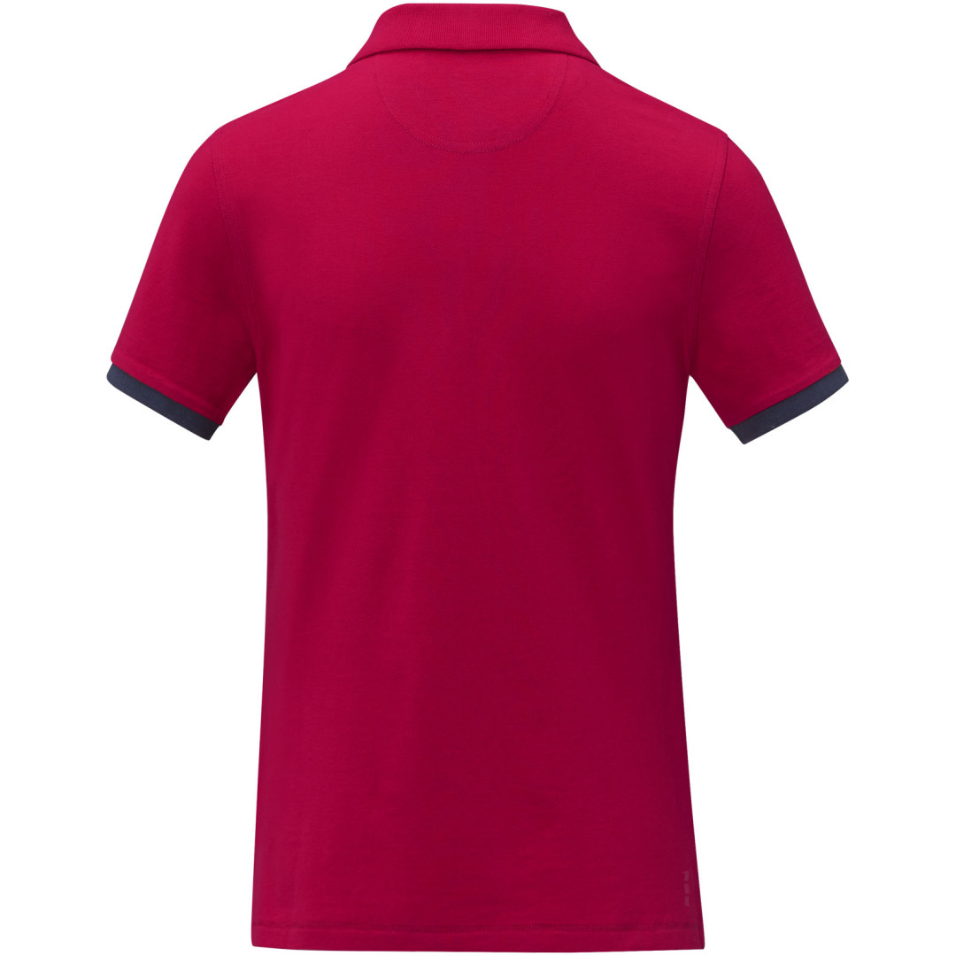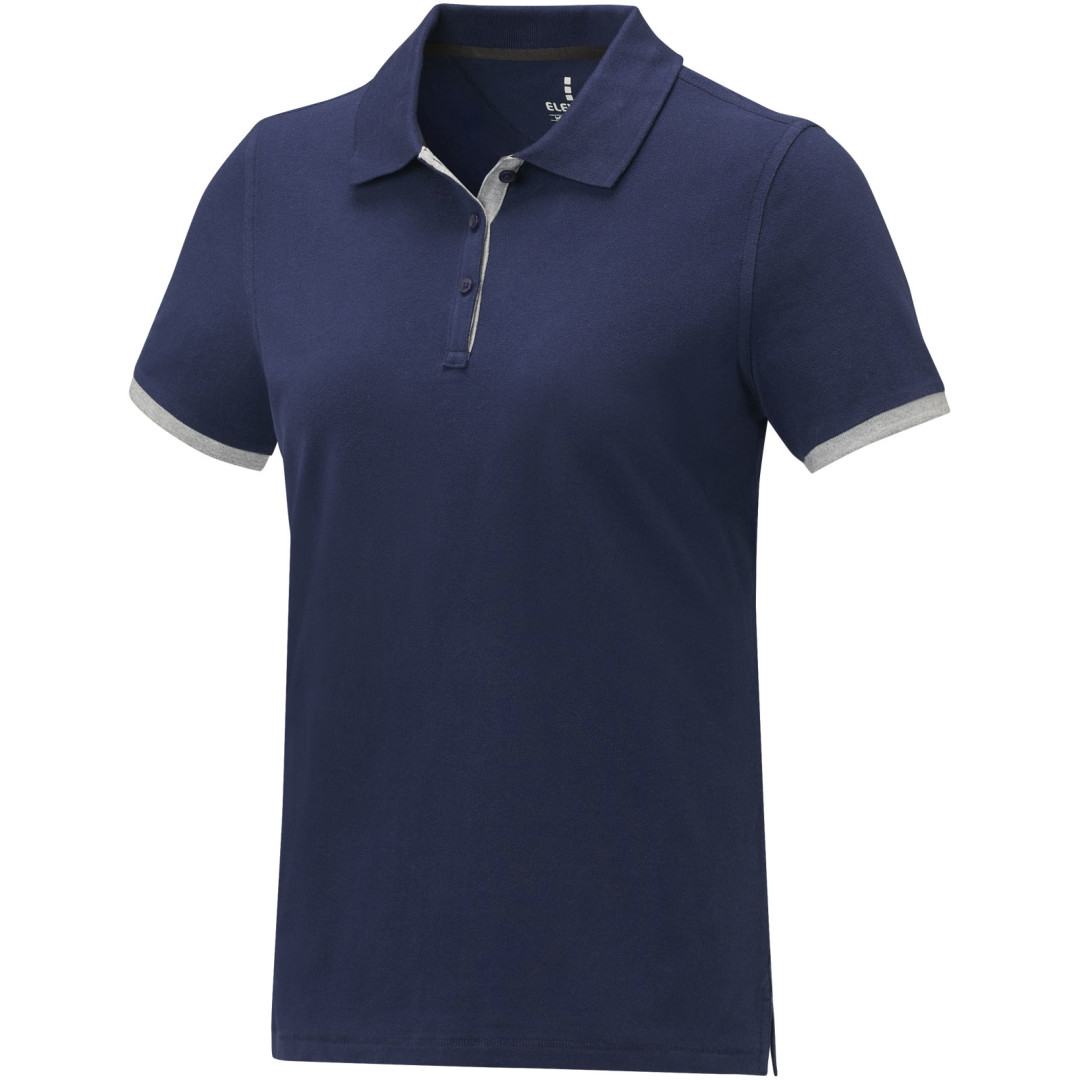 Plochý rebrovaný golier. Rebrovaný úplet manžiet. Kontrastný farebný vnútorný límec a rebrované manžety. Zapínanie na tri gombíky. Detaily s vyšívacím stehom. Saténová lemovka výstrihu. Bočné rázporky so saténovou lemovkou. Sedlo. Predsunutá spevňujúca lemovka výstrihu s retiazkovým švom. Gravírované gombíky v rovnakej farbe. Potlač štítku technológiou heat transfer pre väčšie pohodlie. 200 g/m2