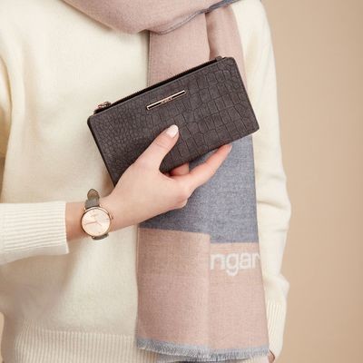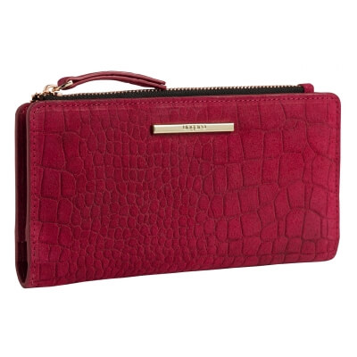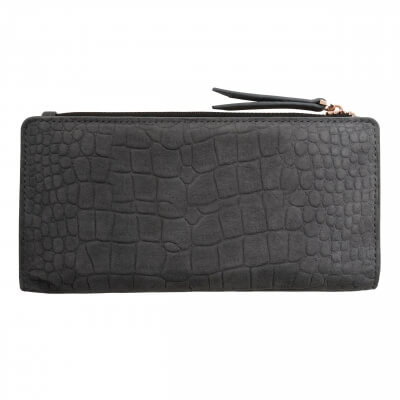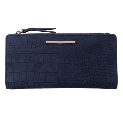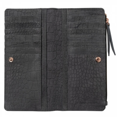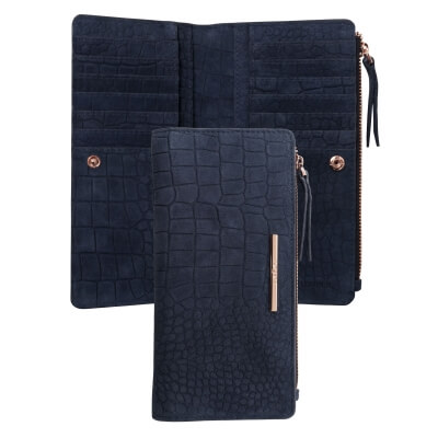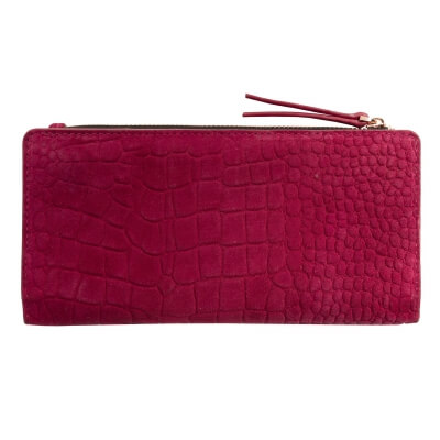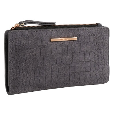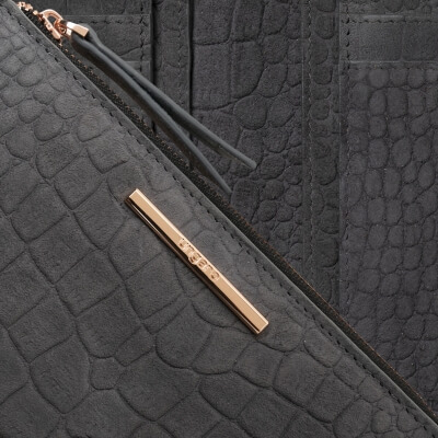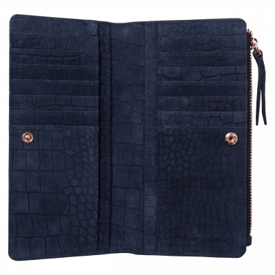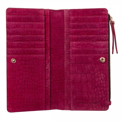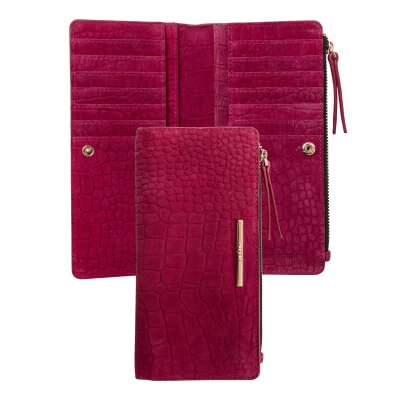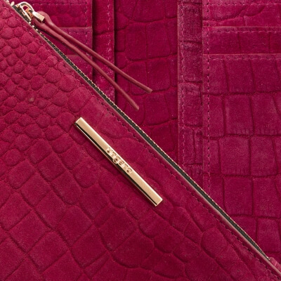 Peňaženka Ungaro "Giada" je vyrobená zo semišovej kože s potlačou vzoru inšpirovaného krokodílou kožou. Charakteristický kovový štítok je v ružovo-zlatej farbe a dodáva celému produktu ženský a luxusný nádych. Položka má 7 priehradiek na karty na každej strane, ako aj väčšie priehradky na poznámky a dokumenty. Má tiež veľkú priehradku na zips.