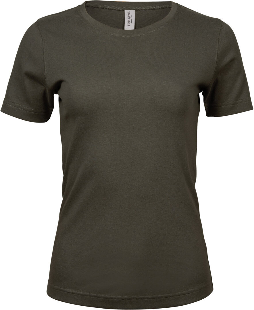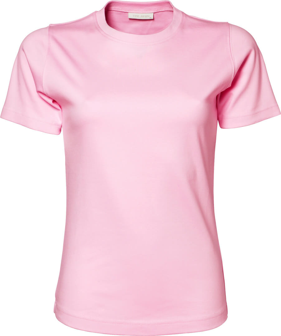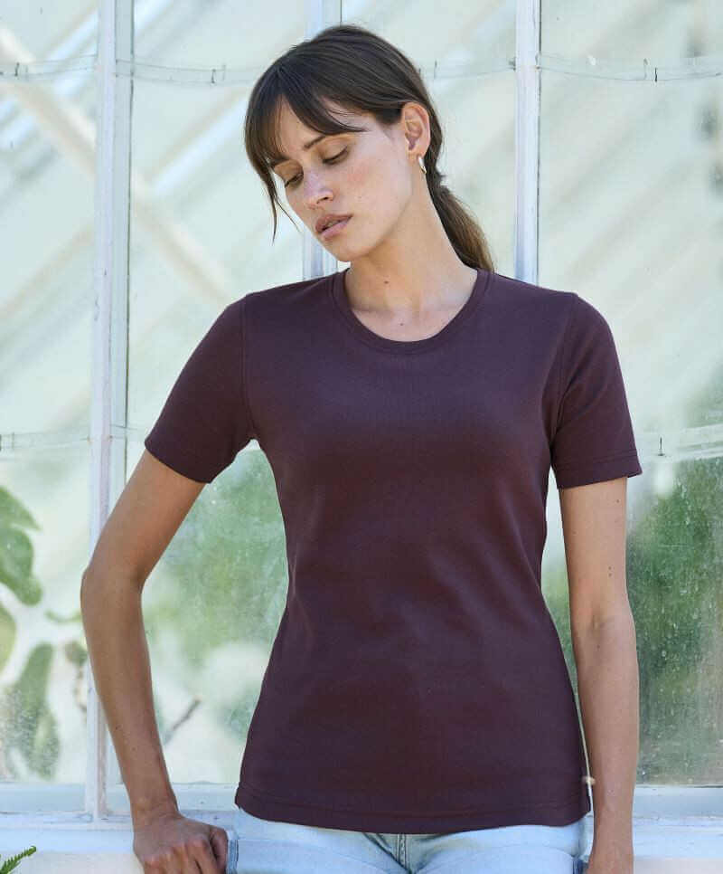 220g / m², 100% česaná bavlna vypasovaný strih, kvalitný bavlnený Interlock, prané v silikónu pre veľmi hebký dotyk, úzky rebrový lem výstrihu, strečový, dvojité prešitie