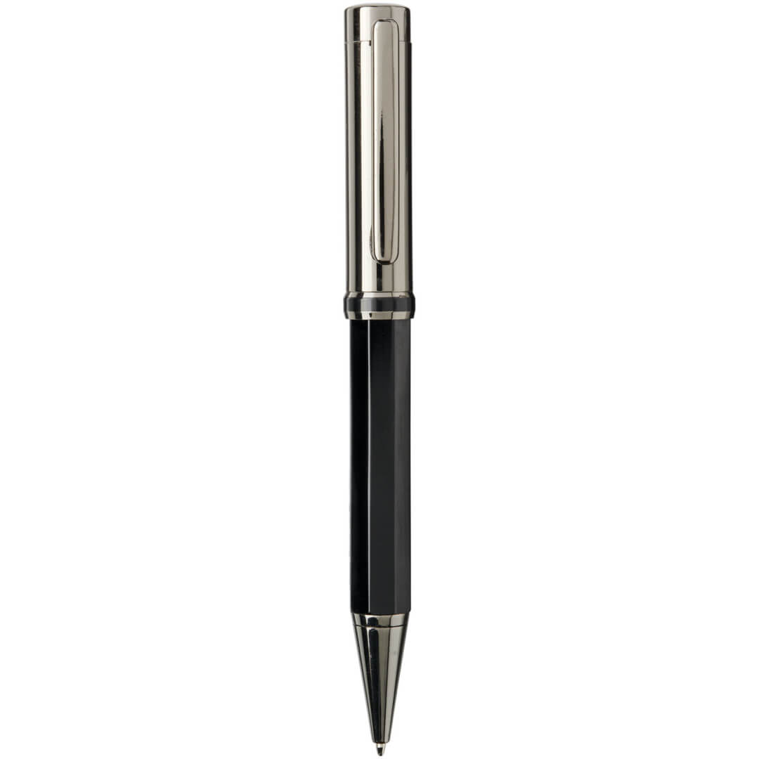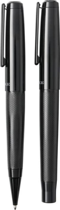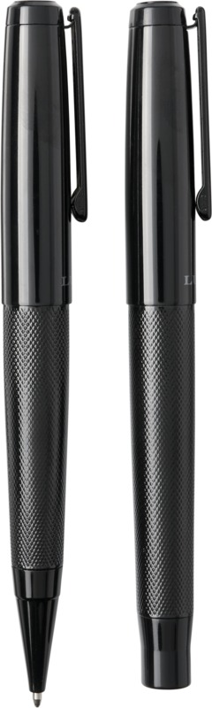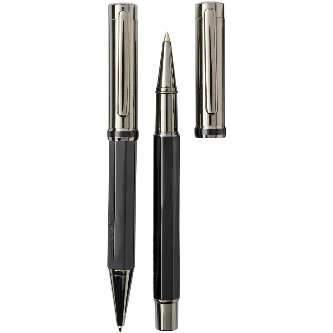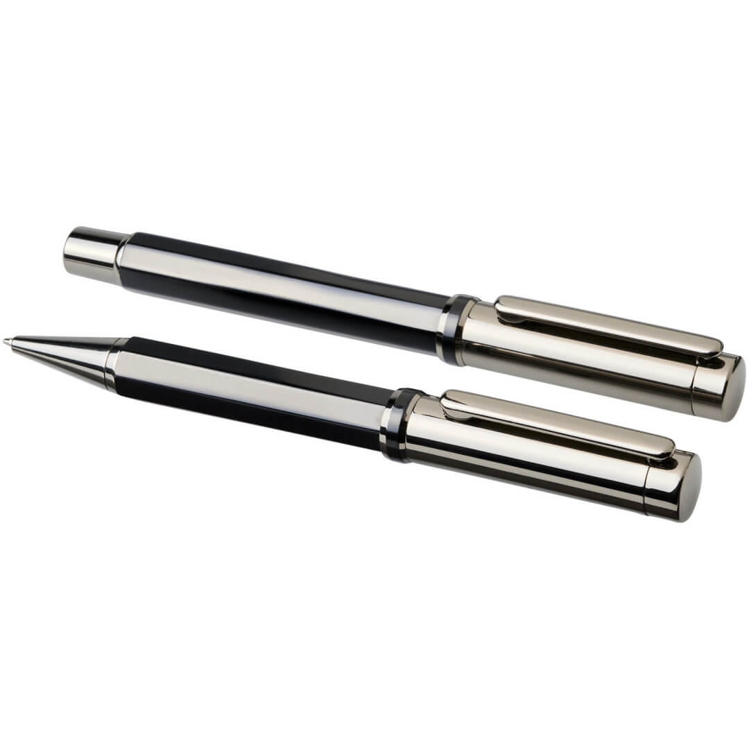 Darčeková sada Gloss s duálnym perom. Darčeková sada s guličkovým perom a valčekovým perom v jednom s čiernou hornou a spodnou časťou s lesklým povrchom dodávaná v darčekovej krabičke Luxe. Guľôčkové pero: 14 cm x 1,45 cm, hmotnosť: 40 g, dĺžka zápisu: 800 m. Valčekové pero: 13,8 cm x 1,45 cm, hmotnosť: 54 g, dĺžka zápisu: 400 m. Kov.