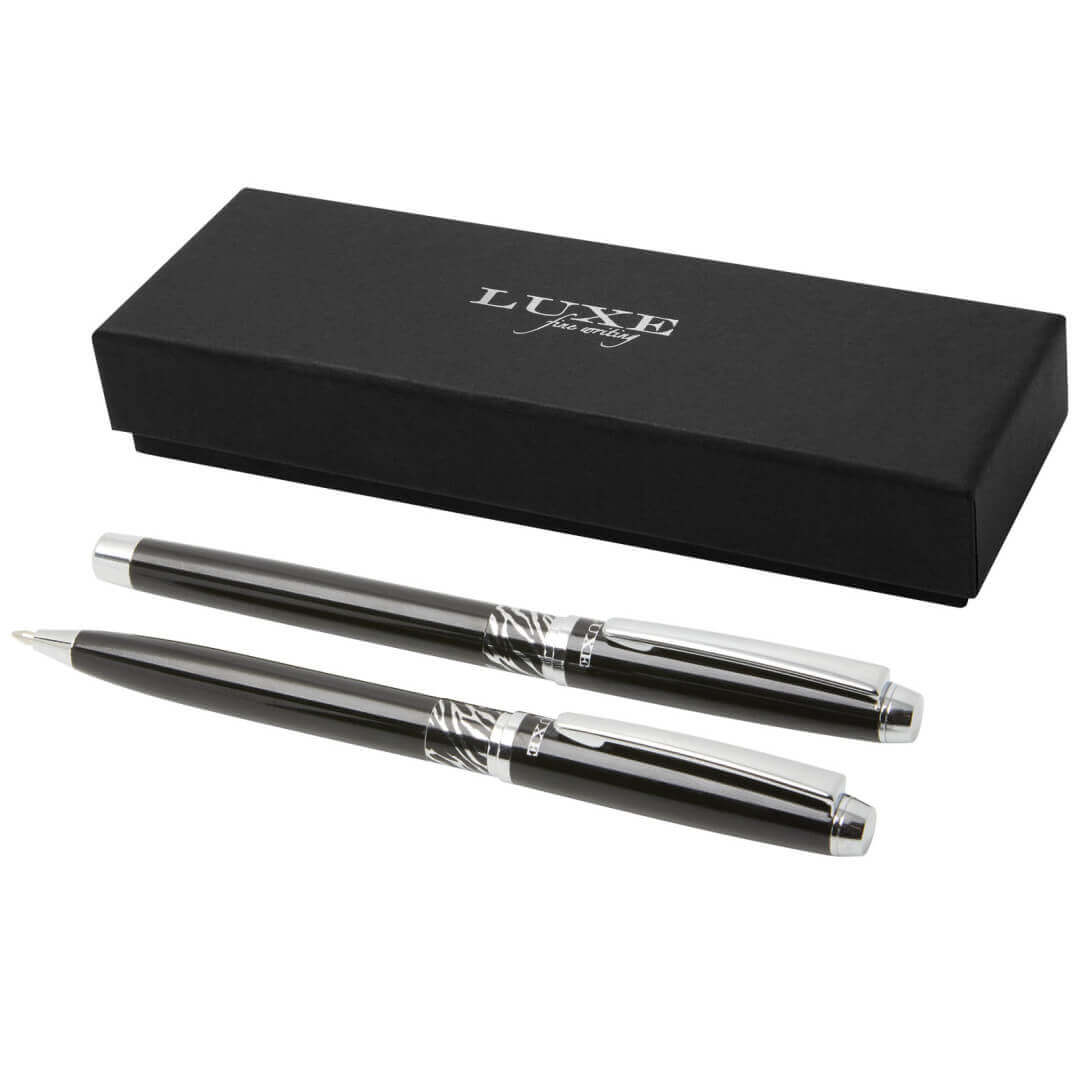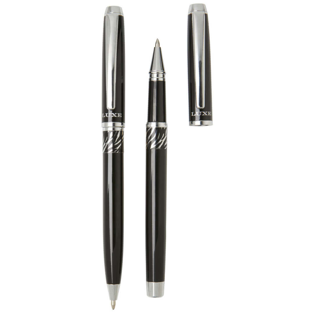 Sada guľôčkového pera a guľôčkového rollera, pier s dekoratívnym vzorom na tele. Guľôčkové pero je vopred naplnené modrým atramentom, zatiaľ čo guľôčkový roller pero je vopred naplnené čiernym atramentom. Zabalené v darčekovej krabičke "LUXE".