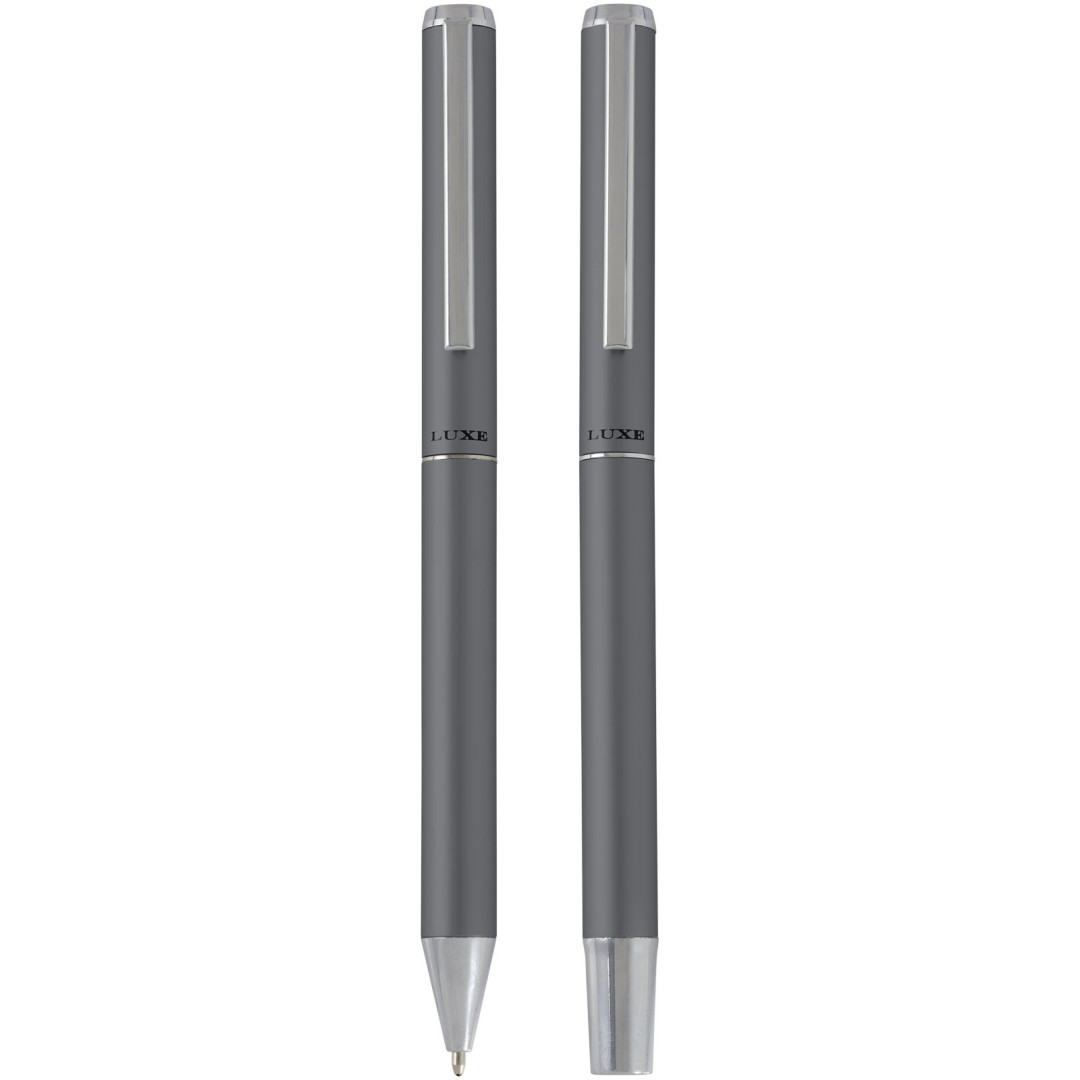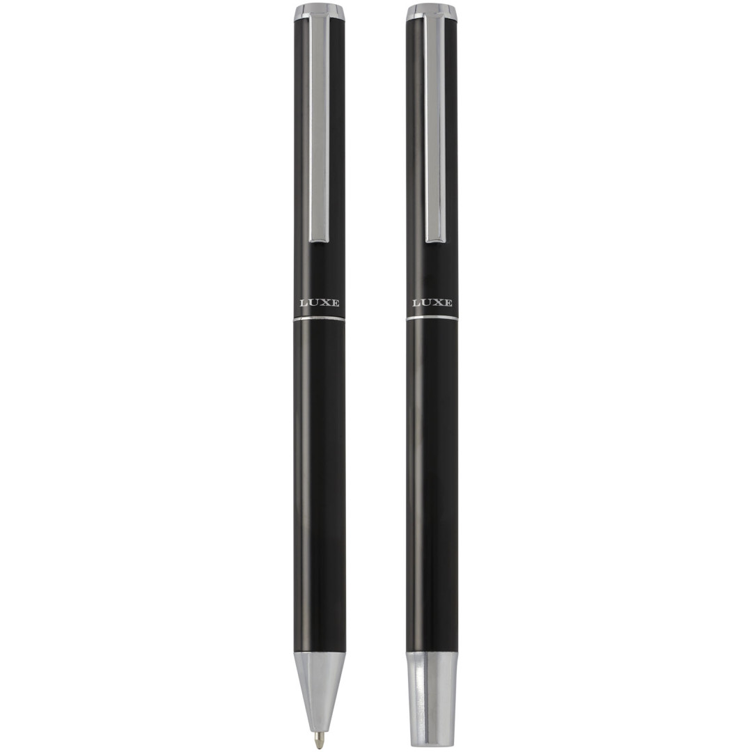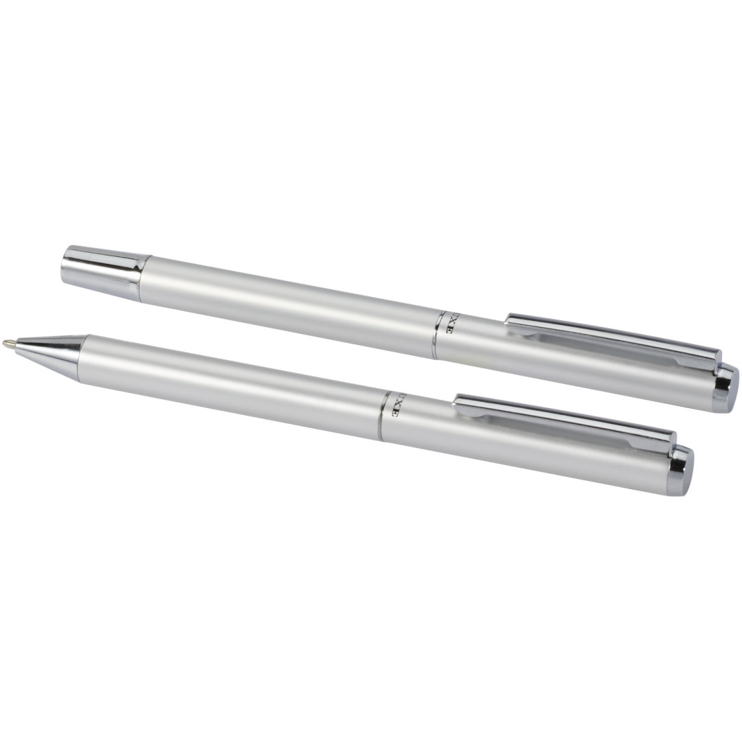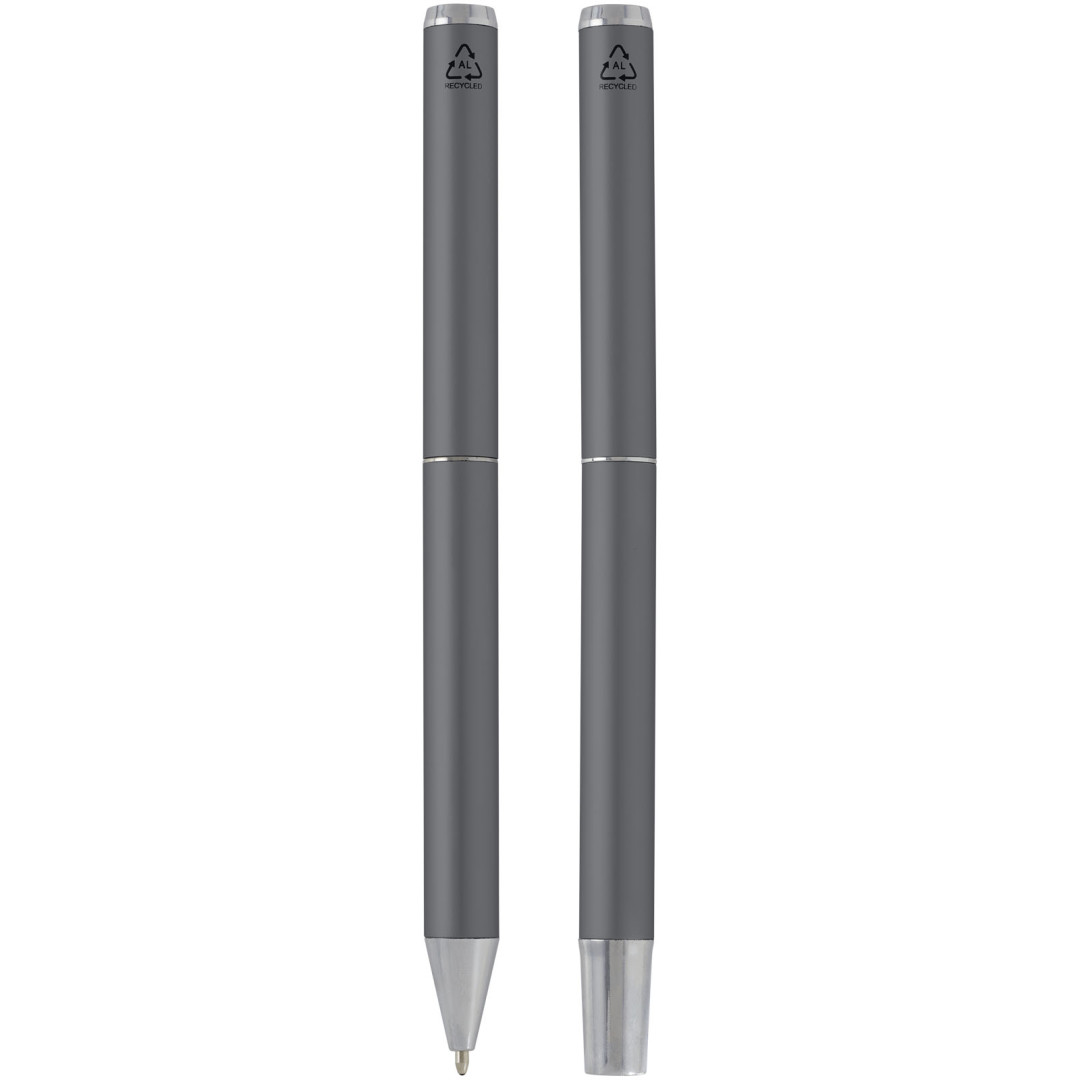 Tubusy pier tejto sady guličkového pera a pera typu roller sú vyrobené z matne farebného eloxovaného recyklovaného hliníka s lesklými chrómovanými doplnkami. Hliník je vysoko recyklovateľný materiál a výberom tejto sady pier môžete podporiť udržateľnejšie postupy výroby a dať nový život vyradeným hliníkovým materiálom. Tieto perá slúžia ako praktická a udržateľnejšia možnosť pre jednotlivcov a organizácie, ktorí hľadajú písacie potreby šetrné k životnému prostrediu. Farba atramentu pera: Čierna. Rozmer hrotu: 1,0 mm. Dĺžka písania: 800 metrov. Dodávané v čiernej darčekovej krabičke s čiernou hodvábnou stuhou. Veľkosť krabičky: 16,2 × 5,1 × 2,7 cm.
