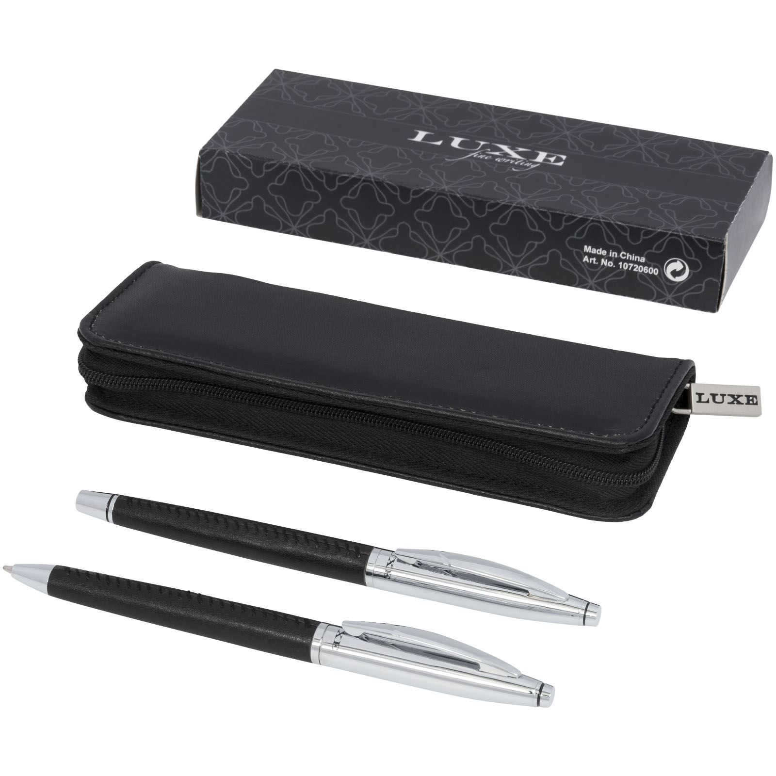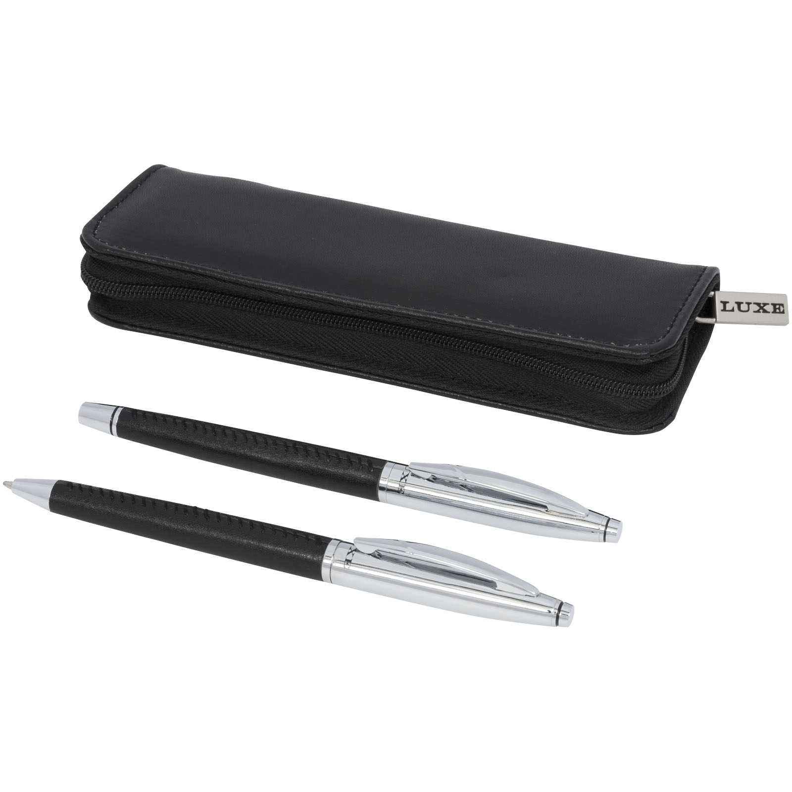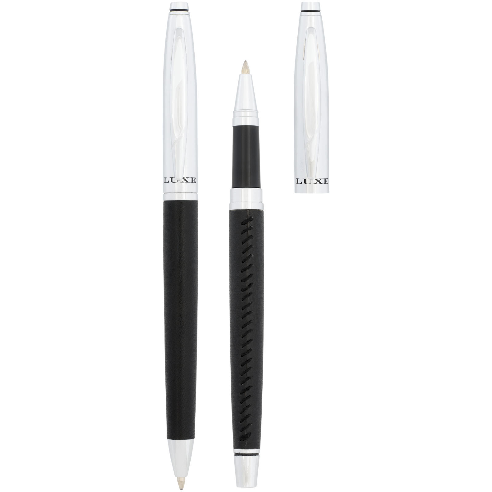 Darčeková sada guľôčkového pera Tombeau. Elegantná darčeková sada guľôčkového pera a rolleru, exkluzívny dizajn. Potiahnuté kožou, s kontrastným prešívaním v modernom štýle. Príslušenstvom je puzdro z imitácie kože pre dve perá. Dodávané v darčekovej kazete LUXE. Kov a imitácie kože.
