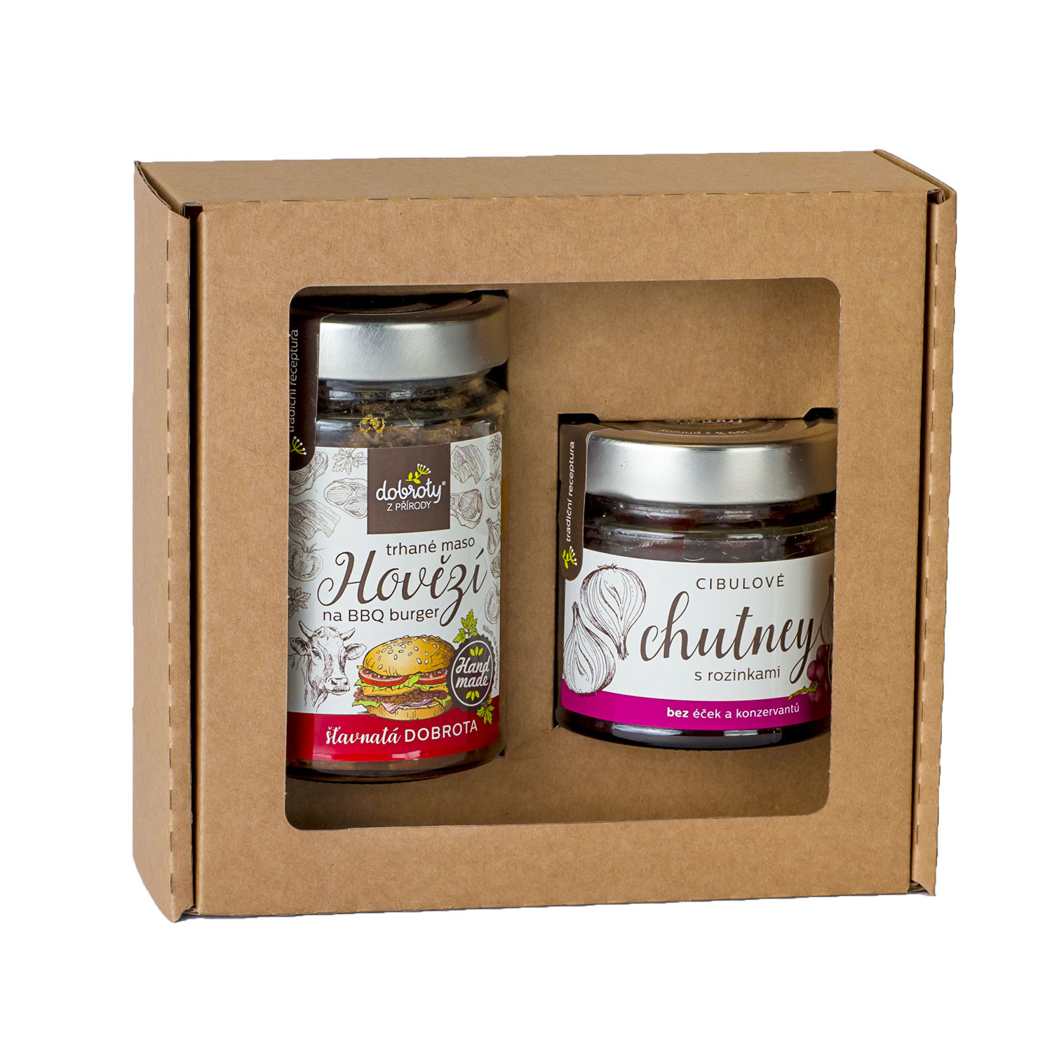 Darčekové balenie obsahuje trhané hovädzie mäso na BBQ burger a sladko-kyslé chutney z červenej cibule. Hovädzie mäso je pomaly varené s korením, slaninou a prírodnou dymovou arómou, ktorá mu dodáva bohatú chuť. Chutney z červenej cibule s hrozienkami a koreninami perfektne dopĺňa a zvýrazňuje chuť mäsa.