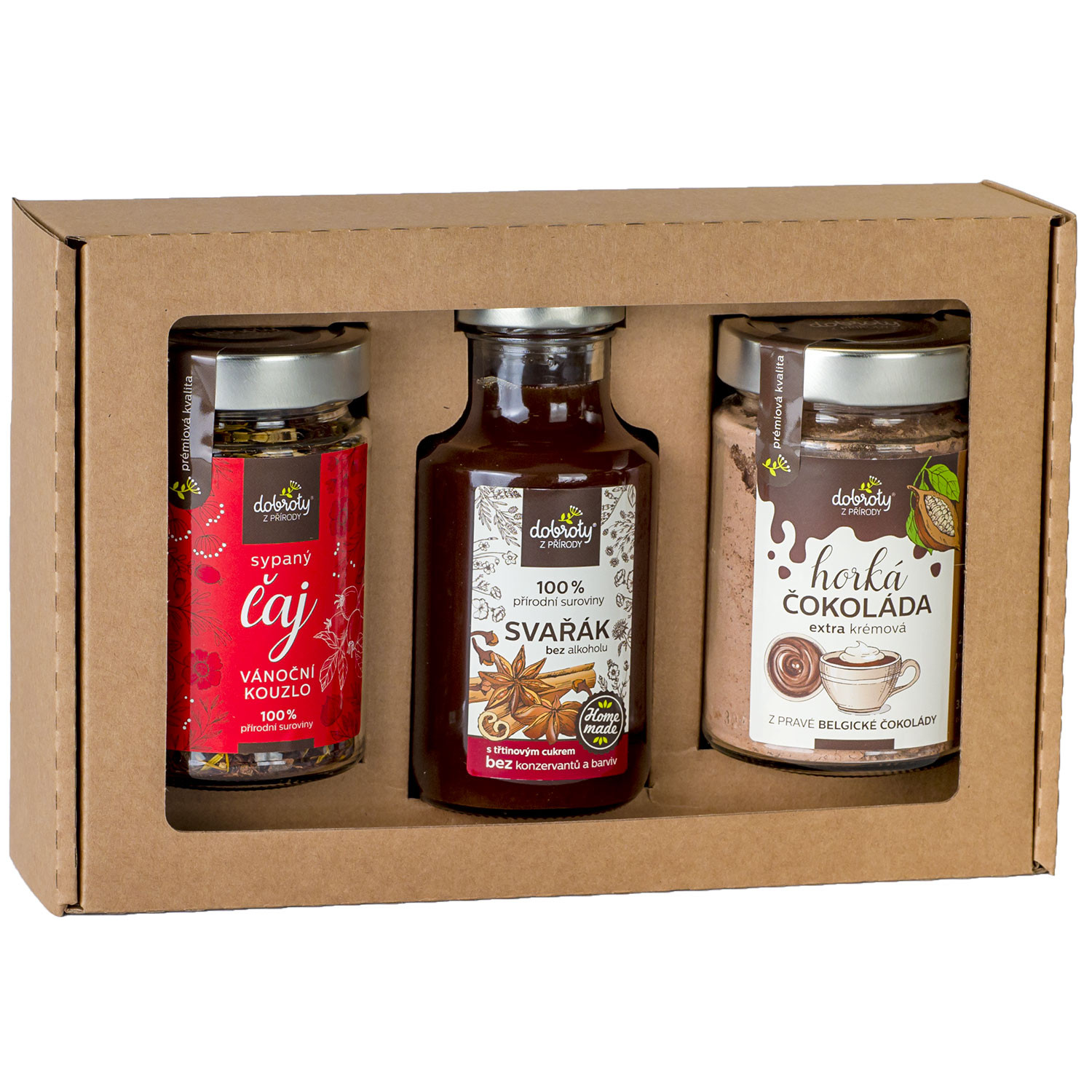 Vianočný darčekový balík obsahuje prírodný bezalkoholový koncentrát varené víno s koreninami, voňavý čaj Vianočné kúzlo plný ovocia a byliniek a lahodnú horúcu belgickú čokoládu. Ideálny na zimné večery plné tepla a pohody