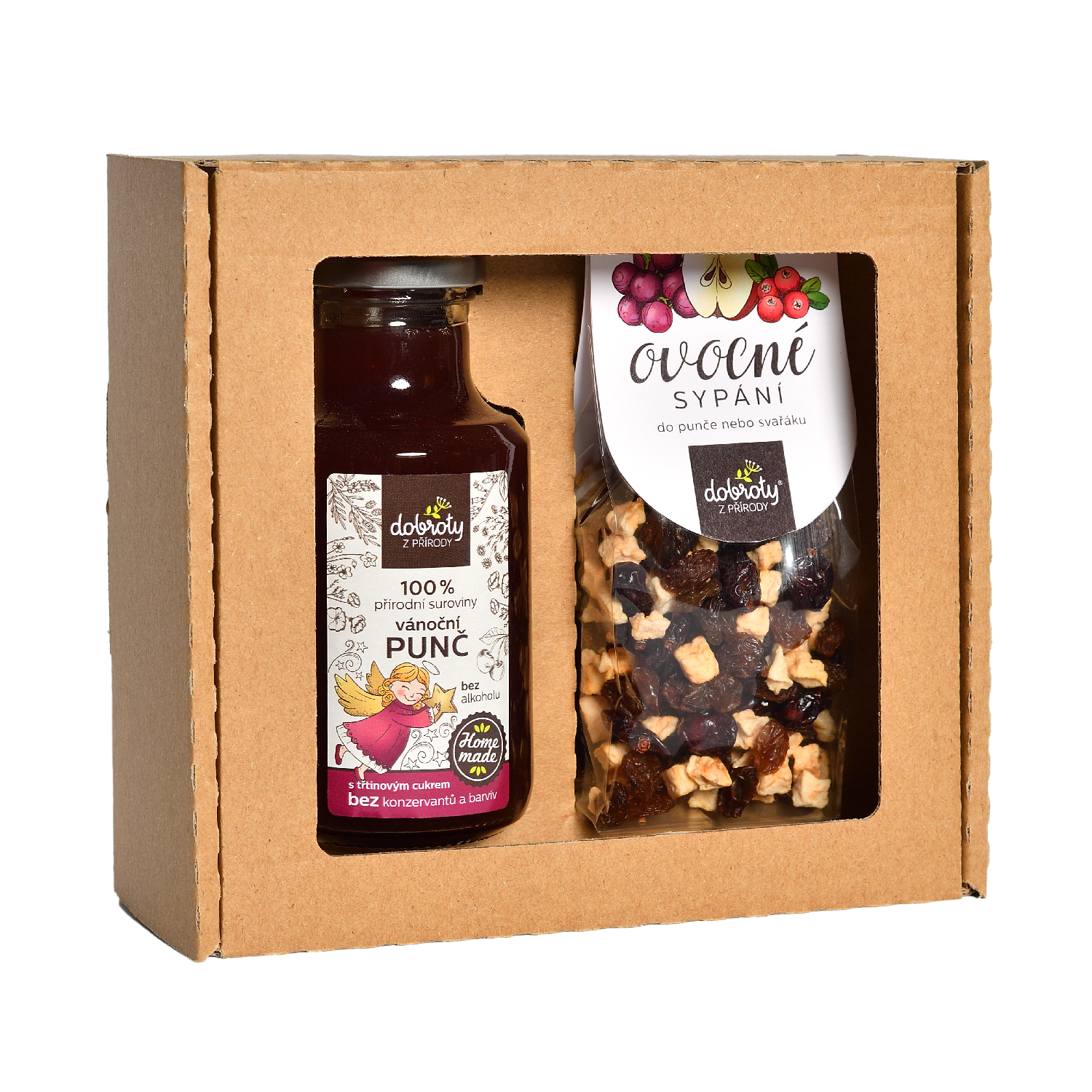 Darčekové balenie PUNČOVÁ obsahuje prírodný koncentrát bez alkoholu a ovocné sypanie do punču alebo vareného vína. Nápojový koncentrát z 100 % prírodných surovín je vhodný na prípravu horúcich i studených nápojov. Jeho jemná chuť dopĺňajú koreniny ako badyán, klinček a muškátový orech. Ovocné sypanie tvorí mix nesírených hrozienok, sušených brusníc a jabĺk, ktorý nápoj obohatí o sladkú ovocnú chuť a príjemnú textúru.
