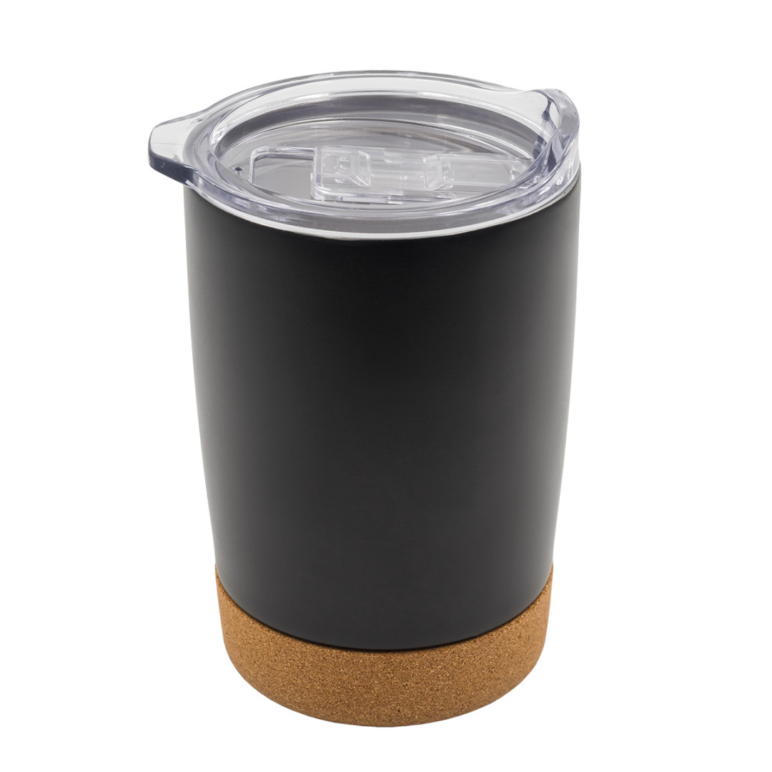 Darčeková sada obsahujúca termohrnček, dáždnik, zápisník a pero zabalená v elegantnej čiernej krabičke. Zápisník A5 v pevnej väzbe s 80 štvorčekovými listami (70 g/m2). Termohrnček s objemom 350 ml vyrobený z recyklovanej nerezovej ocele s priehľadným viečkom, korkovým dnom a čiernym matným povrchom. Dáždnik s korkovou rukoväťou vo vodeodolnom obale vyrobený z RPET pongee 190T, rebrá dáždnika vyrobená zo sklolaminátu. Pero s telom z korku, modrou náplňou a hrotom 1,0 mm.