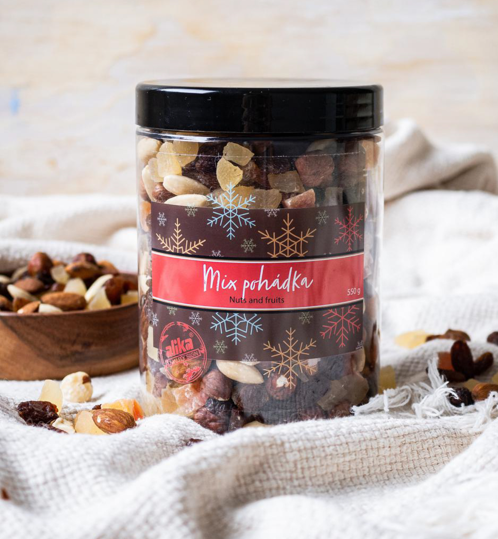 Tri balenia mixu orechov v dózach s vianočným motívom. Dózy sú balené v bielej alebo hnedej krabici s mašľou, podľa aktuálnej dostupnosti výrobcu.