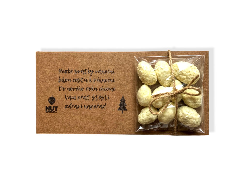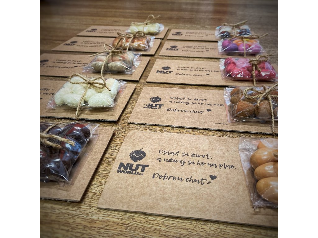 Univerzálna darčeková kazetka vyskladaná na mieru – vlastný mix orechov, firemný branding, kartička s odkazom aj farebná mašľa. Ideálne pre klientov, zamestnancov či eventy. Napíšte nám a pošleme návrh a kalkuláciu. Uvedená cena je za konkrétny produkt na foto - mandle v bielej čokoláde a kokose 50 g.