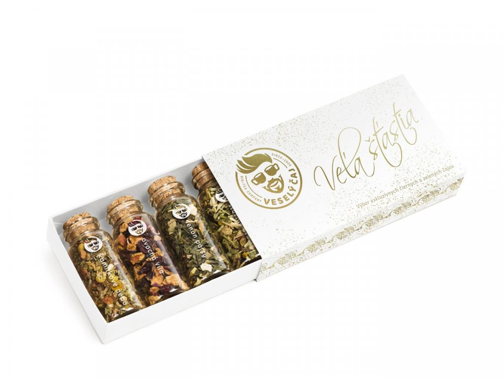 Veľa šťastia je originálny set piatich sypaných čajov v skle s korkom: