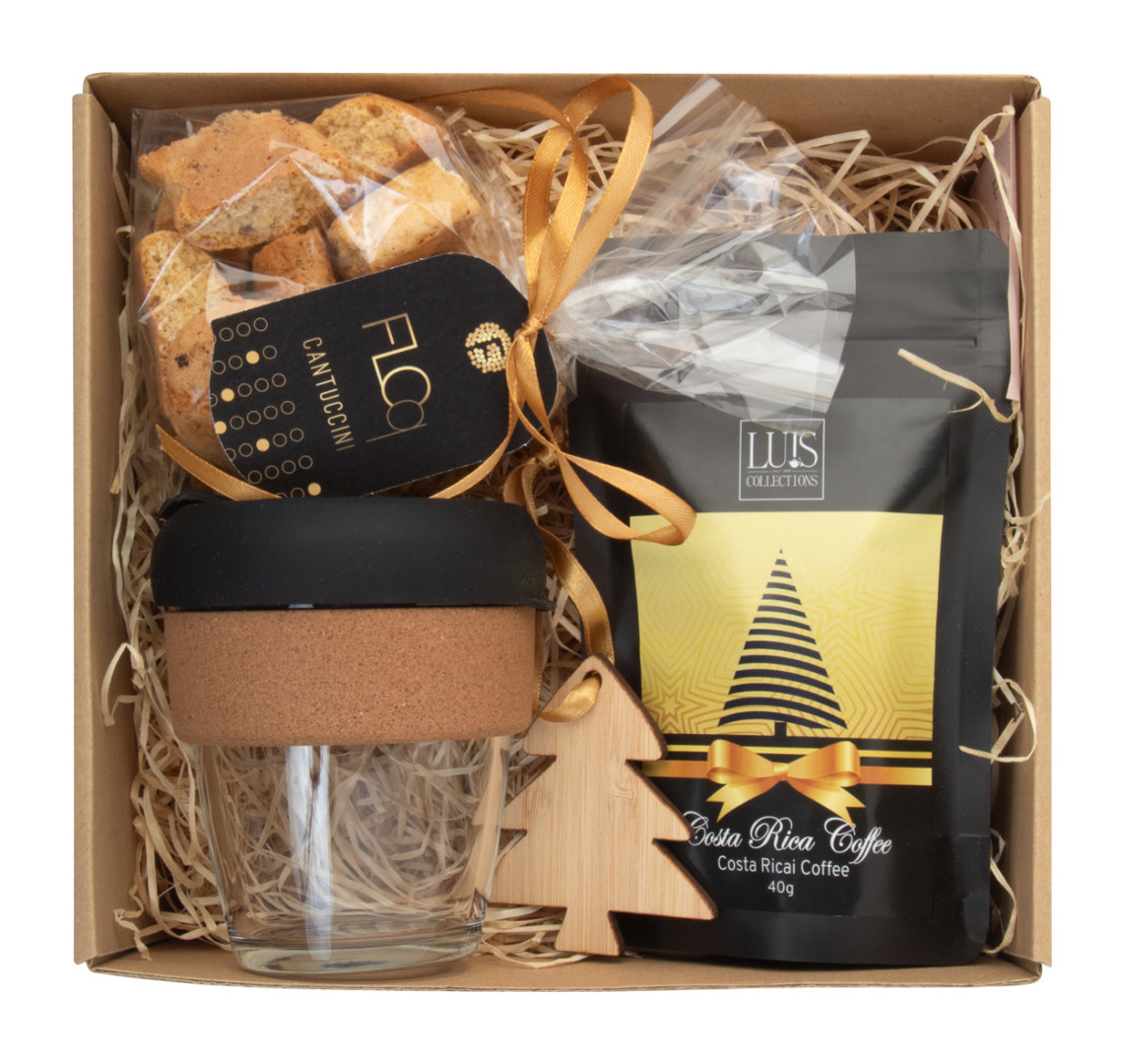 Kávová darčeková sada v darčekovej krabičke z kraftového kartónu s výplňou z drevitej vlny a červenou stuhou. Obsahuje: sklenený cestovný hrnček "Tarkol"; Káva "Luis" Costa Rica (40 g); "Floq" remeselnej cantuccini (100 g); Ozdobu na vianočný stromček "Holonda".