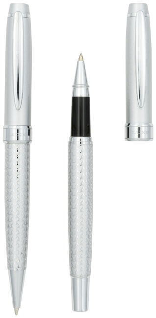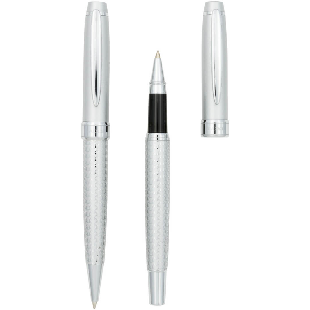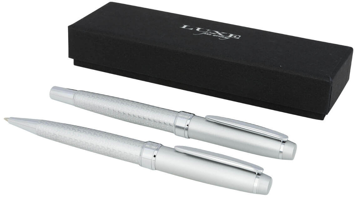 Darčeková sada guľôčkové pero. Ideálny spôsob, ako vyryť vaše meno do povedomia ľudí, táto exkluzívne navrhnutá dvojica guľôčkového a Rollerball pera má krásne ryté telo a vyhradené miesto na viečku pre tlač vašej dekorácie. Vrátane prémiovej, čiernej, atramentovej náplne a zabalené v LUXE darčekovej krabičke (16x5x2,5). Kov.