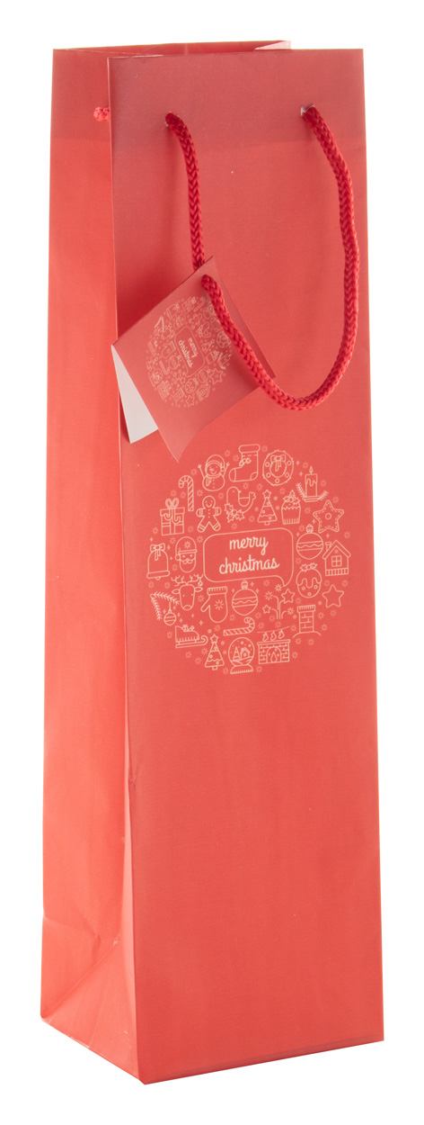 Papierová darčeková taška na fľašu vína s matným laminom vo vianočnom designe a s darčekovou visačkou.