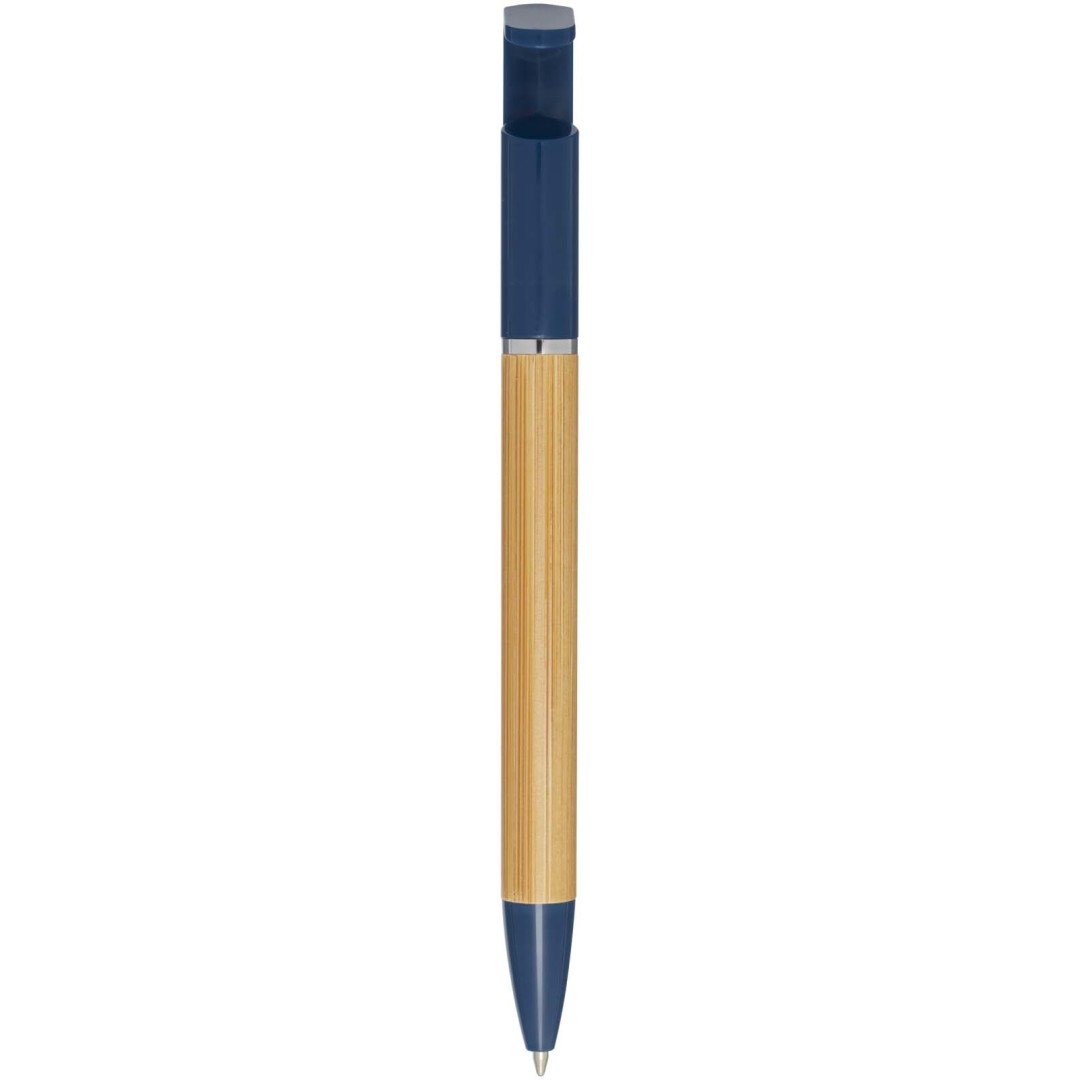Bambusové guľôčkové pero, ktoré funguje aj ako držiak na telefón. Tlačidlo a stredový krúžok sú vyrobené z recyklovaného plastu, hrot z mosadze a telo z bambusu zo zodpovedných zdrojov. Farba atramentu: Modrá. Dĺžka písania: 1000 metrov. Rozmer hrotu: 1,0 mm. FSC certified bambus. FSC Mix Credit N5 CU-COC-877277.