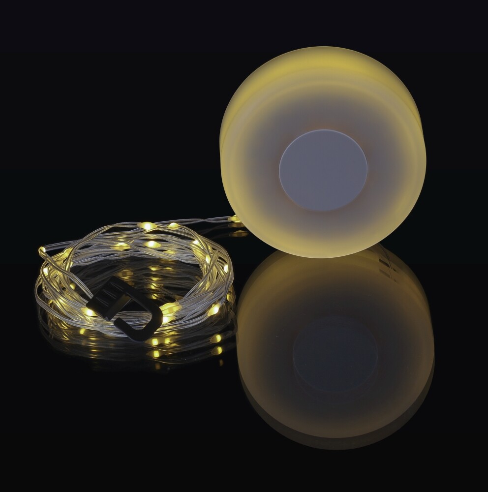 Svetlo z ABS plastu s dobíjacou kempingovou lampou s dvoma svetelnými funkciami. Súčasťou je 8metrový svetelný reťazec, ktorý je možné navíjať pomocou cievky. Napájané batériou s kapacitou 1 000 mAh s nabíjaním cez konektor typu C. Jednotlivo balené v hnedej kartónovej krabici. Výška: 4,8 cm