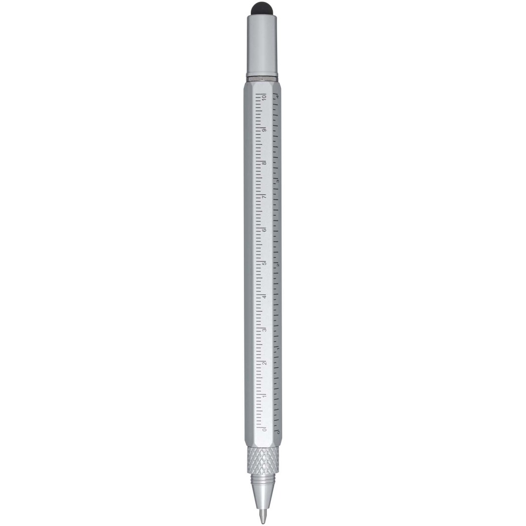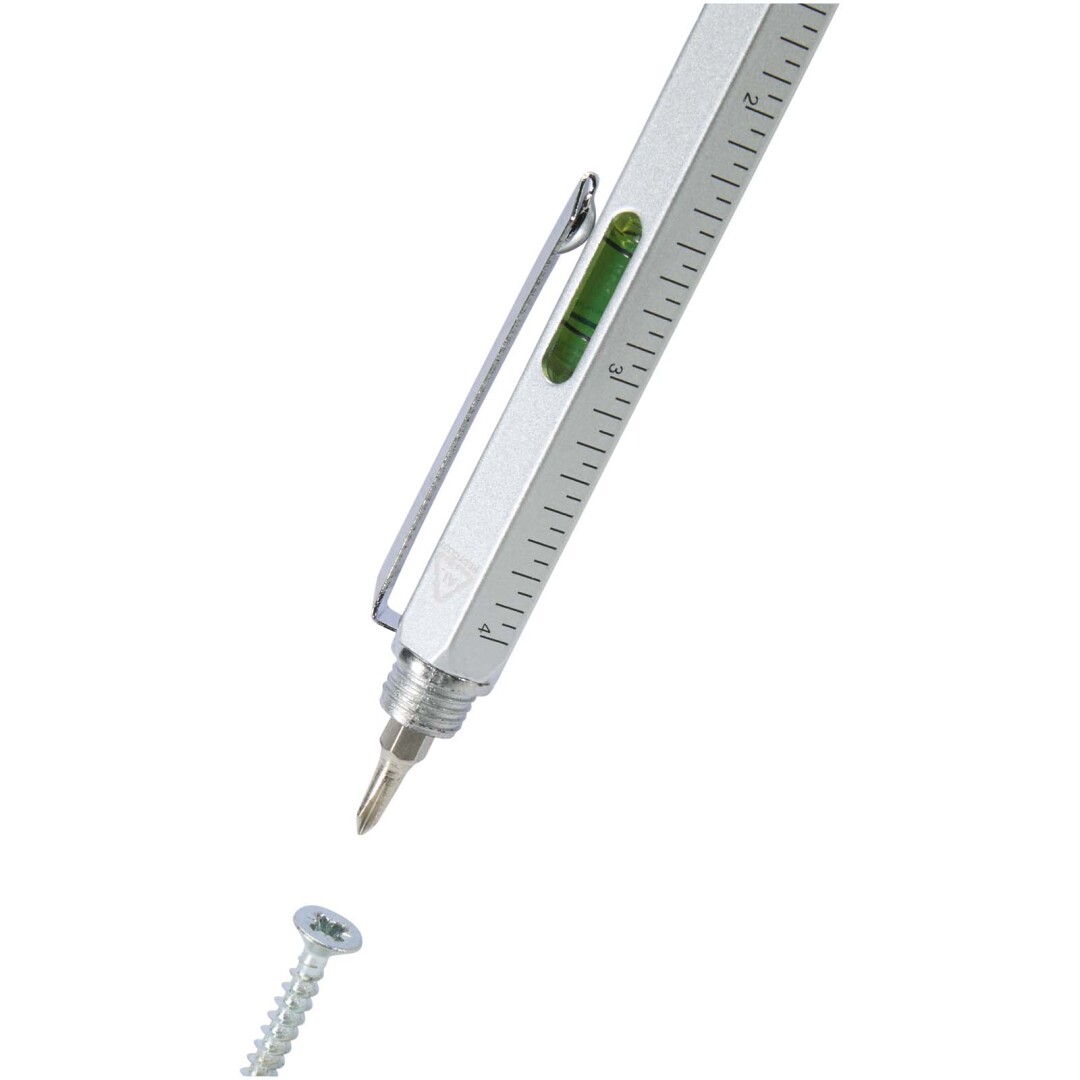 Hliníkové multifunkčné guličkové pero Dora je čiastočne vyrobené z recyklovaných materiálov a je vybavené obojstranným pravítkom, páčkou, skrutkovačom, pomôckou na meranie uhla sklonu a čiernym stylusom z gumy. Telo je vyrobené z recyklovaného hliníka so strieborným nástrekom. Spona je vyrobená zo železa. Skrutkovač je vyrobený z ocele. Horná časť a špička sú vyrobené z materiálu RABS. Farba atramentu: Čierna. Dĺžka písania: 400 metrov. Rozmer hrotu: 1,0 mm.