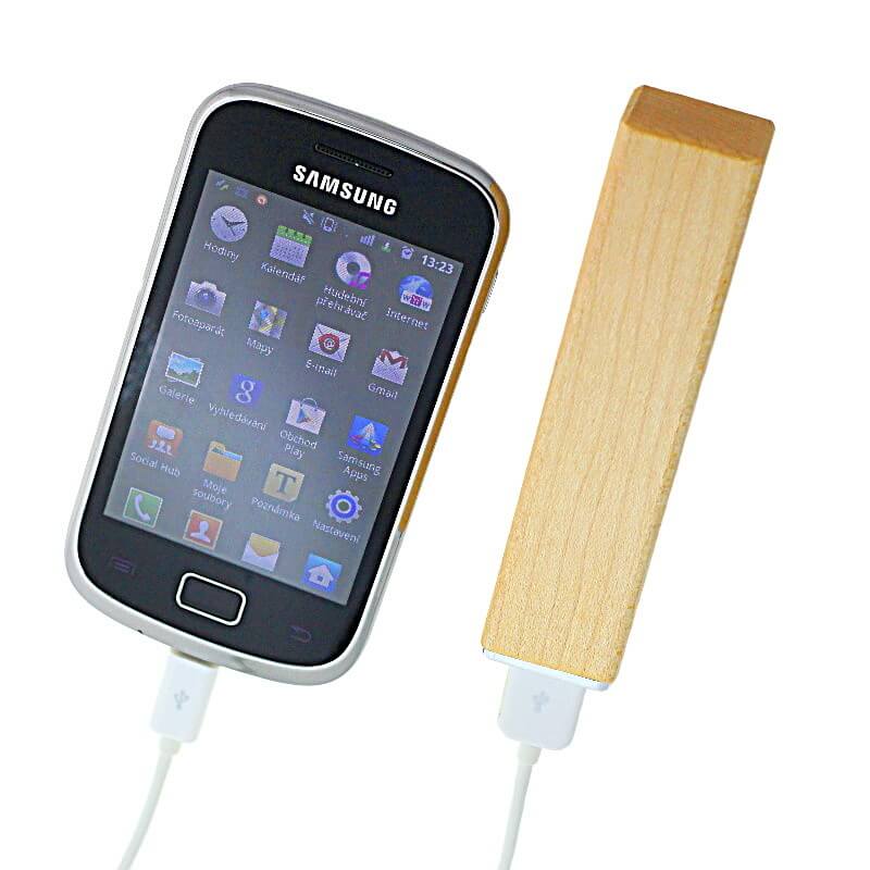 DREVENÁ MINI POWERBANKA (EXTERNÁ NABÍJAČKA) 2000 až 3000 mAh. Malé rozmery, ideálny model do vrecka. Nabitie powerbanky zaistíte cez USB konektor počítača (prípadne sieťový adaptér) a cez micro USB, popr. iný konektor následne nabijete Váš mobilný telefón alebo iné zariadenie. Plne nabitá powerbanka zaistí 1-2 nabitie mobilného telefónu, podľa kapacity jeho batérie. Nabíja iPhone, mobily, MP3, kamery a pod.