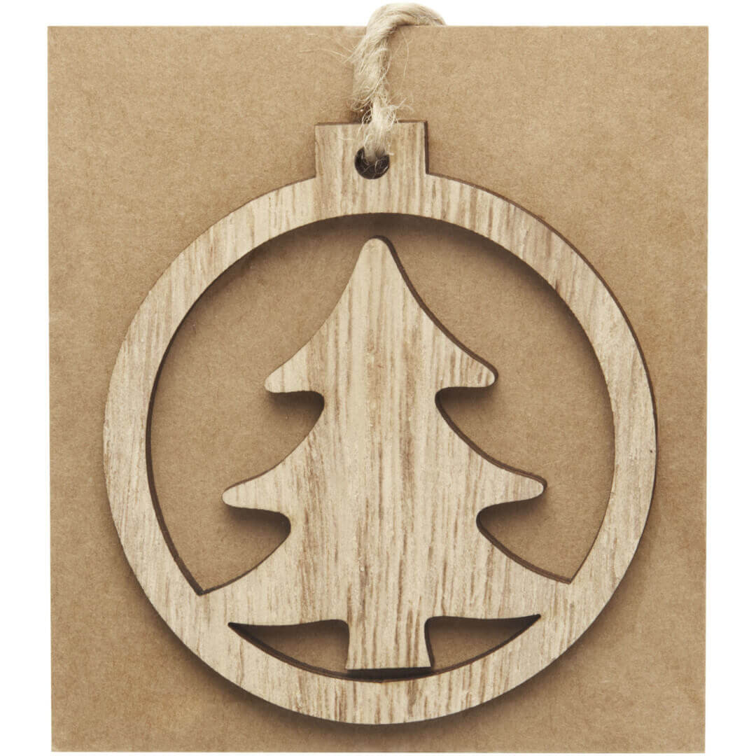 Okrúhla drevená ozdoba so stromom vo vnútri. Možno zavesiť za háčik so šnúrkou. Ručne balená, s kartičkou z kraftového papiera na zadnej strane.