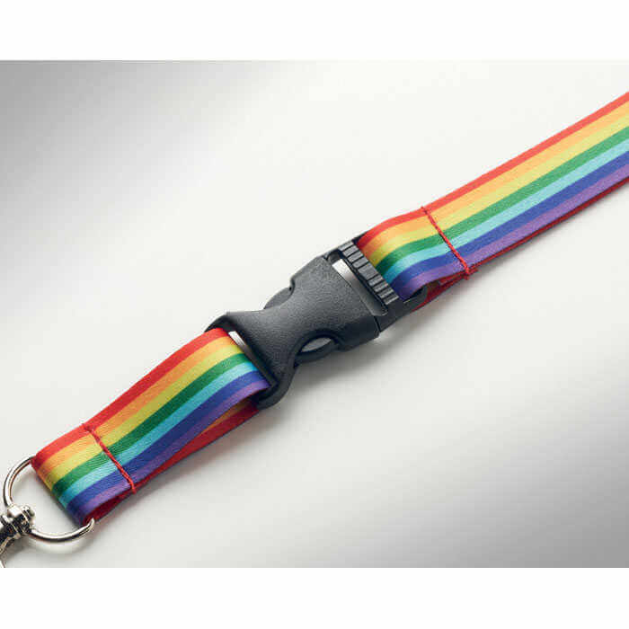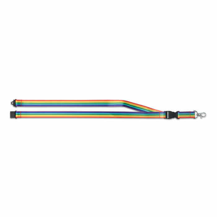 Dúhová RPET šnúrka s kovovou karabínou, odnímateľnou sponou a bezpečnostnou poistkou. Veselá a farebná šnúrka, na ktorú môžete pripevniť kľúče, menovky, preukazy alebo iné príslušenstvo. S touto šnúrkou na krku si vás určite všimnú.