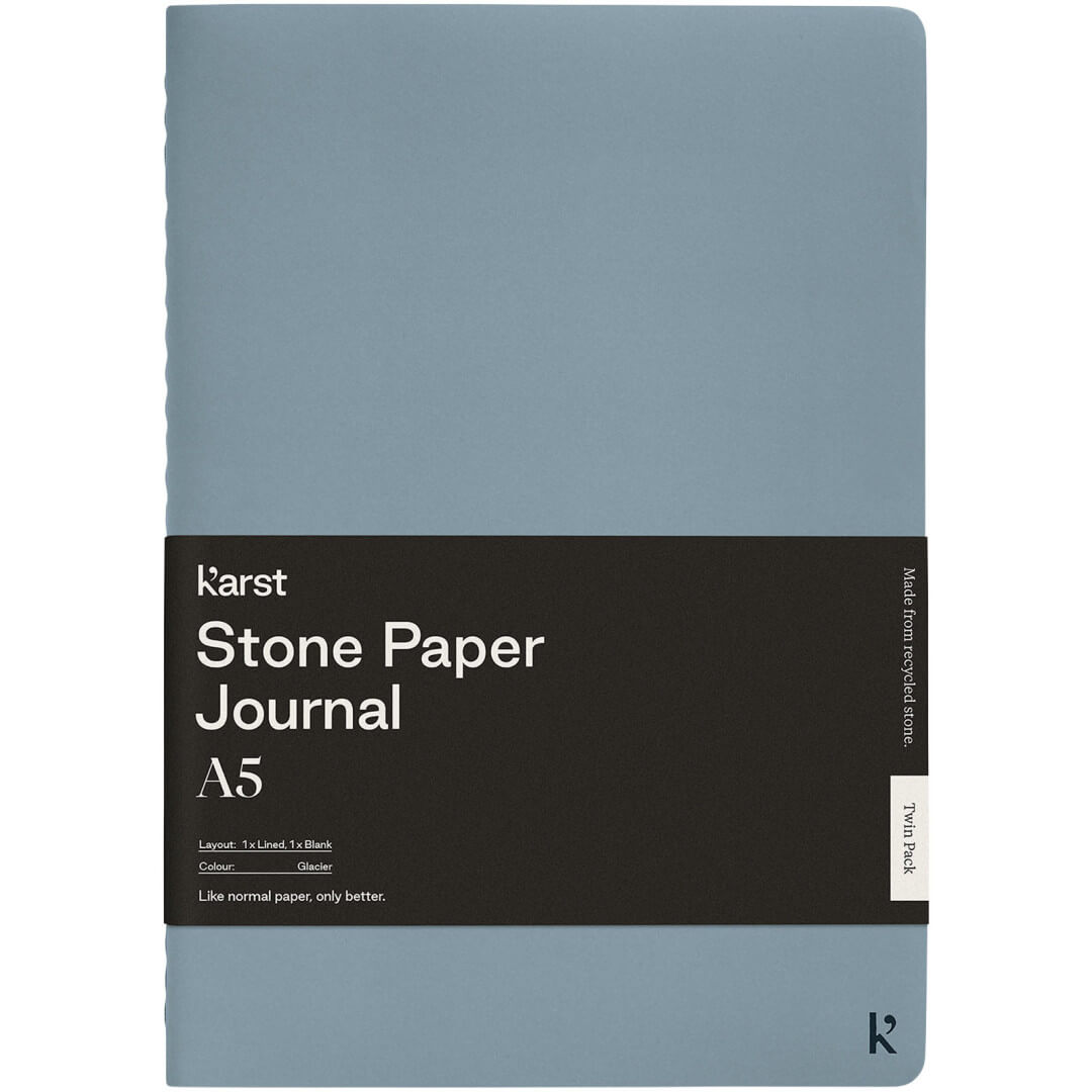Sada 2 denníkov A5 vyrobených z vysoko kvalitného a udržateľného kamenného papiera. Jeden z denníkov má linajkové stránky a druhý má prázdne stránky, aby sa zapojili obe mozgové hemisféry. Jedinečný, ekologický materiál sa vyrába bez použitia kyselín, je jasne biely a vodeodolný, s prémiovým vzhľadom a dojmom. Má dierované stránky pre ľahké vybratie, jedinečný vodeodolný obal, zadné puzdro na ukladanie poznámok, viazanie stehom (farebne zladené) a zaoblené rohy.