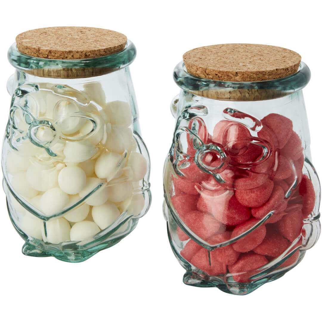 Súprava z recyklovaného skla s dvoma 650 ml nádobami na suché potraviny s korkovým vekom. Vyrobené z 2 sklenených fliaš. Recyklované sklo sa vyrába s použitím menšieho množstva energie, surovín a aditív, než je nutné na výrobu tradičného skla. Veľkosť nádoby: výška 14,5 cm, priemer 12 cm.