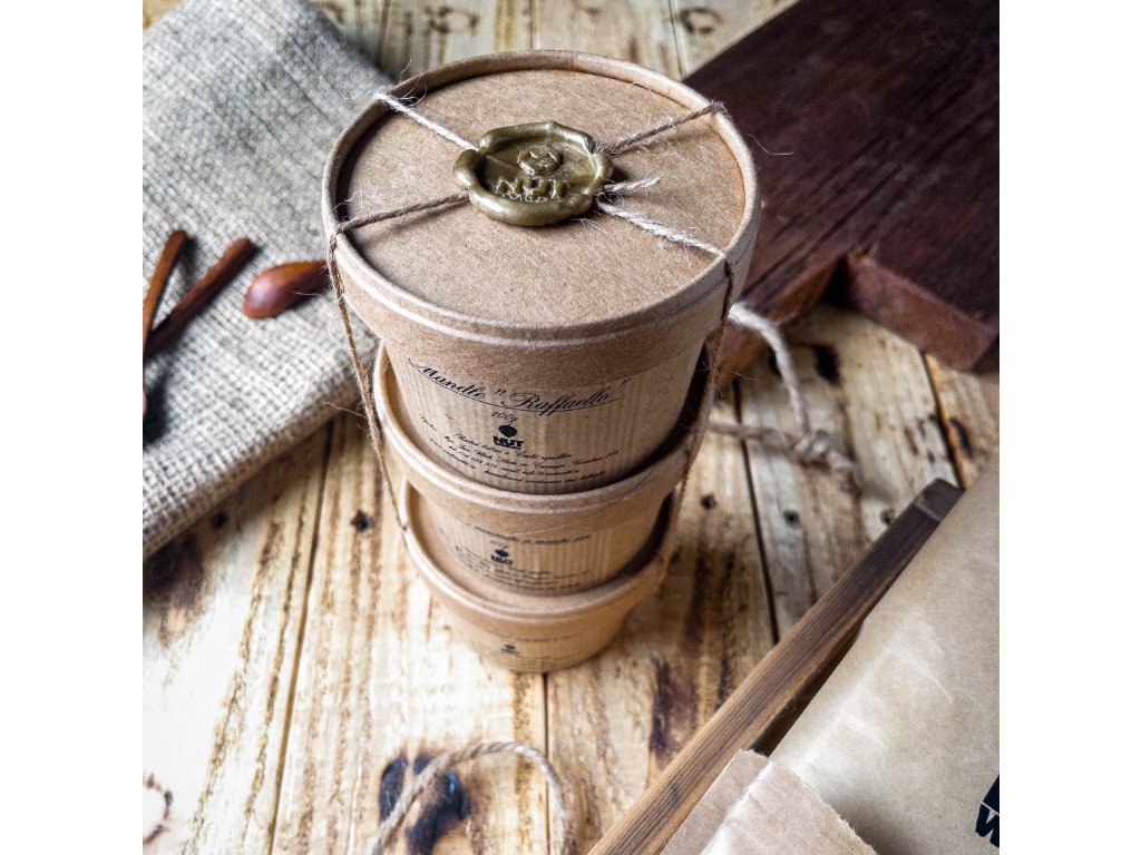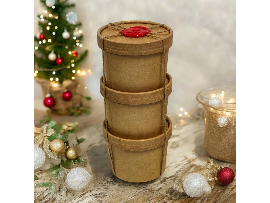 Udržateľný darček s efektom „wow“. Do dizajnovej krabičky uložíme eko papierové kelímky naplnené podľa vašich preferencií (oriešky prírodné/solené, sušené ovocie, čokoládové dražé). Vršky uzavrieme pečaťou – s vaším logom, monogramom alebo sezónnym motívom – v zladenej farbe. Na želanie pridáme kartičku s poďakovaním/QR, stuhu či visačku. Skvelé na Vianoce, uvítacie balíčky aj VIP pozornosti. Na mieru: obsah, počet kelímkov, farby, branding. Termín a cena podľa počtu kusov a zvoleného obsahu. Vonkajší rozmer kelímka: horný Ø 90 mm, výška 70 mm, spodný Ø 75 mm. Cena za mandle údené, mandle v mede a soli, mandle v karamele s vanilkou 14,14 €
