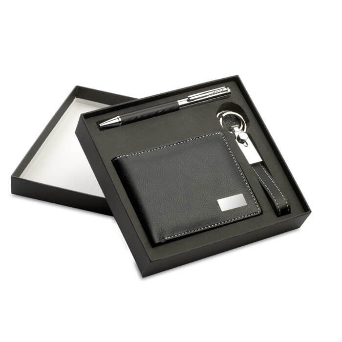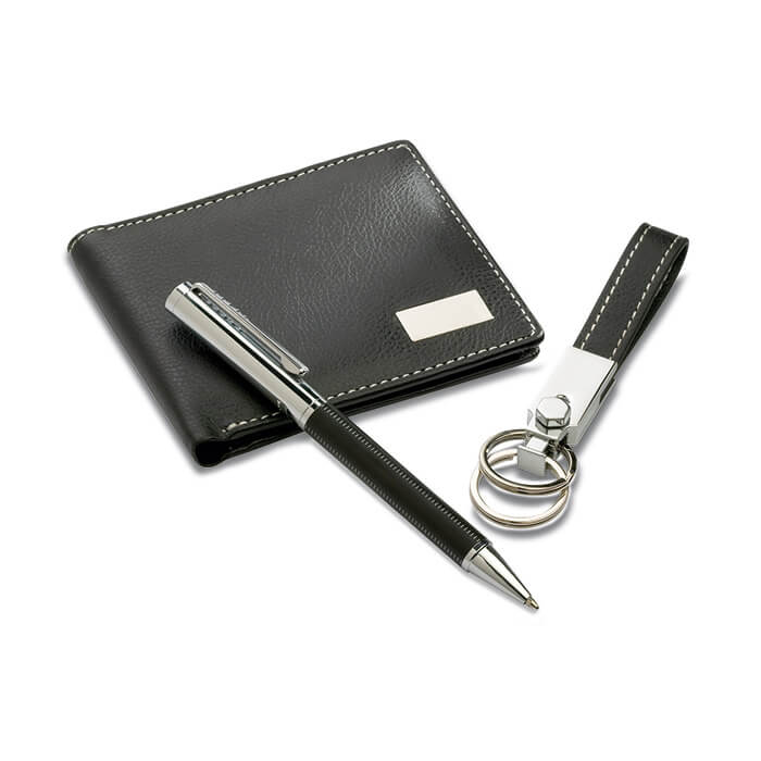 Elegantná darčeková sada v papierovej krabičke. Guličkové pero s modrou náplňou, kovová kľúčenka s PU pútkom a PU peňaženka. Všetky PU časti s kontrastným prešitím.