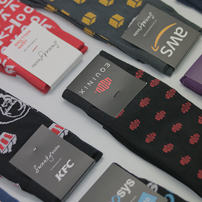 Elegantné ponožky na mieru, materiál: 65% česaná bavlna, 30% nylon, 5% elastan. Jedna veľkosť sadne väčšine. Zlaďte najobľúbenejšie dizajny s imidžom vašej spoločnosti. Vyberte si z 32 tkaných vzorov, dajte nám vedieť svoje želané farby pantone (až 6 farieb), vyberte miesto, kam pridať návrhy loga a vyberte obal. Máte vytvorený jedinečný darček.