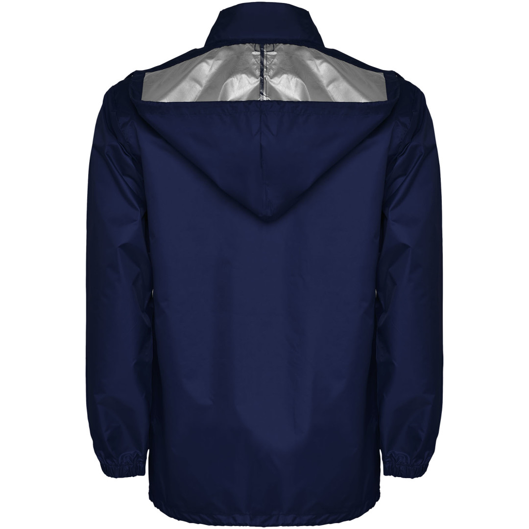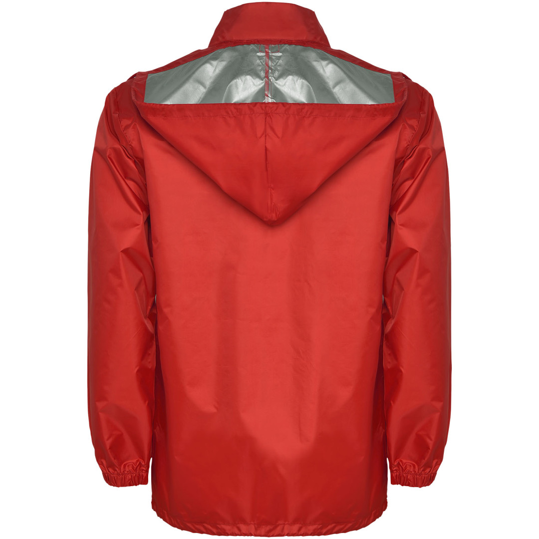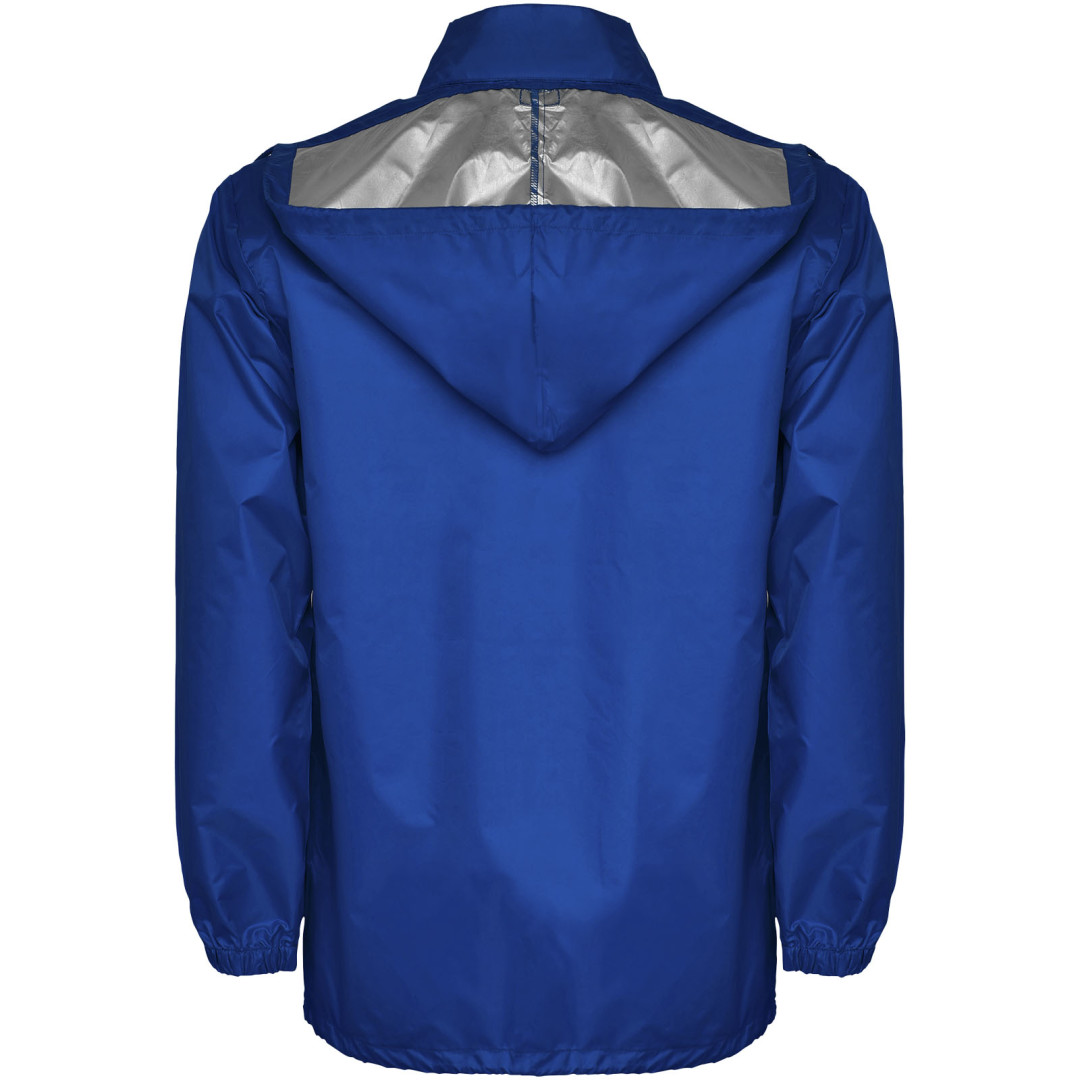 Nepremokavý plášť do dažďa. Vysoký výstrih a skladacia kapucňa s nastaviteľnou šnúrkou. Predný zips so zodpovedajúcim ťaháčikom. Dve bočné vrecká s príklopkou. Elastické manžety. Elastický pás, vnútorné vrecko na skladanie a uskladnenie. Nepremokavý model. Modelka meria 185 cm a má na sebe veľkosť L.