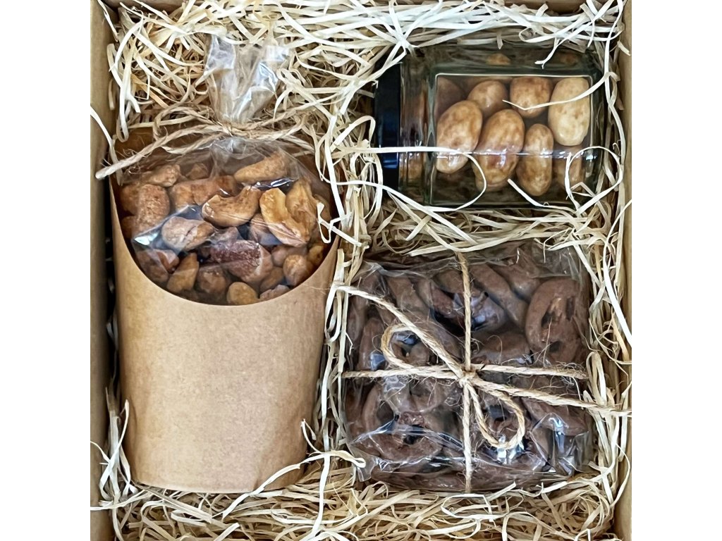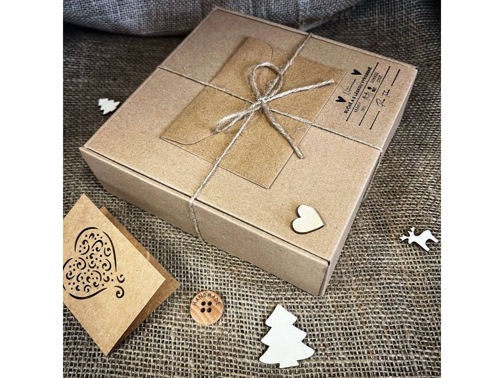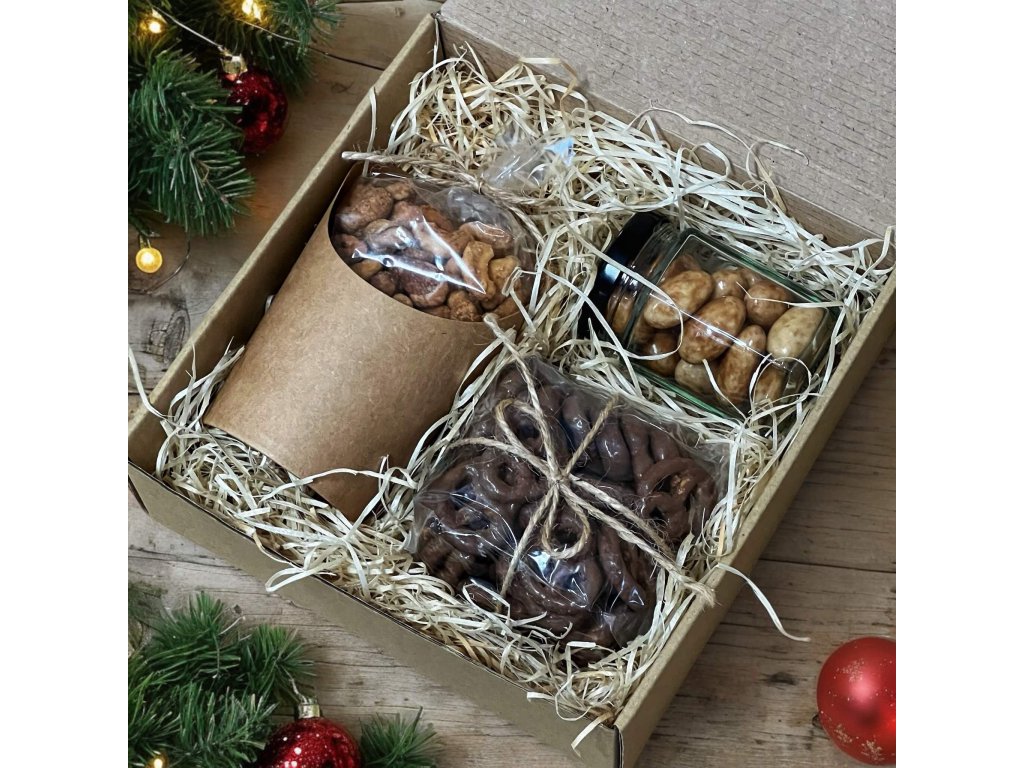 Štýlová darčeková krabička, ktorá po otvorení poteší mixom dobrôt v troch formátoch – eko kelímok, celofánový sáčok a sklenená dóza. Obsah si zvolíte na mieru: chrumkavé orechy natur alebo solené, orechy v mede, čokoládové variácie, sušené ovocie či iné pochutiny. Všetko balíme ručne a čerstvo, s citom pre detail. Radi doladíme aj prezentáciu – transparentné alebo nepriehľadné viečko, stuha či jutový povrázok, personalizovaný odkaz, vaše logo alebo pečať. Rozmer balenia je 185 × 185 × 60 mm a zloženie nastavíme tak, aby vo vnútri pôsobilo uhladene a reprezentatívne. Napíšte nám svoje preferencie a rozpočet; pripravíme návrh, ktorý bude chutiť aj vyzerať skvelo. Cena za 60 g mandle tiramisu, 90 g praclíky v mliečnej čokoláde, 180 g mix orechov v mede a soli 14,14 €