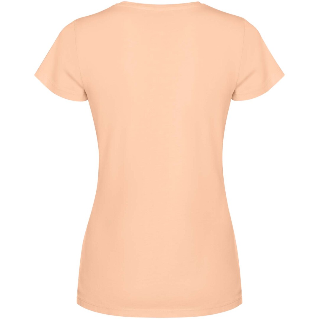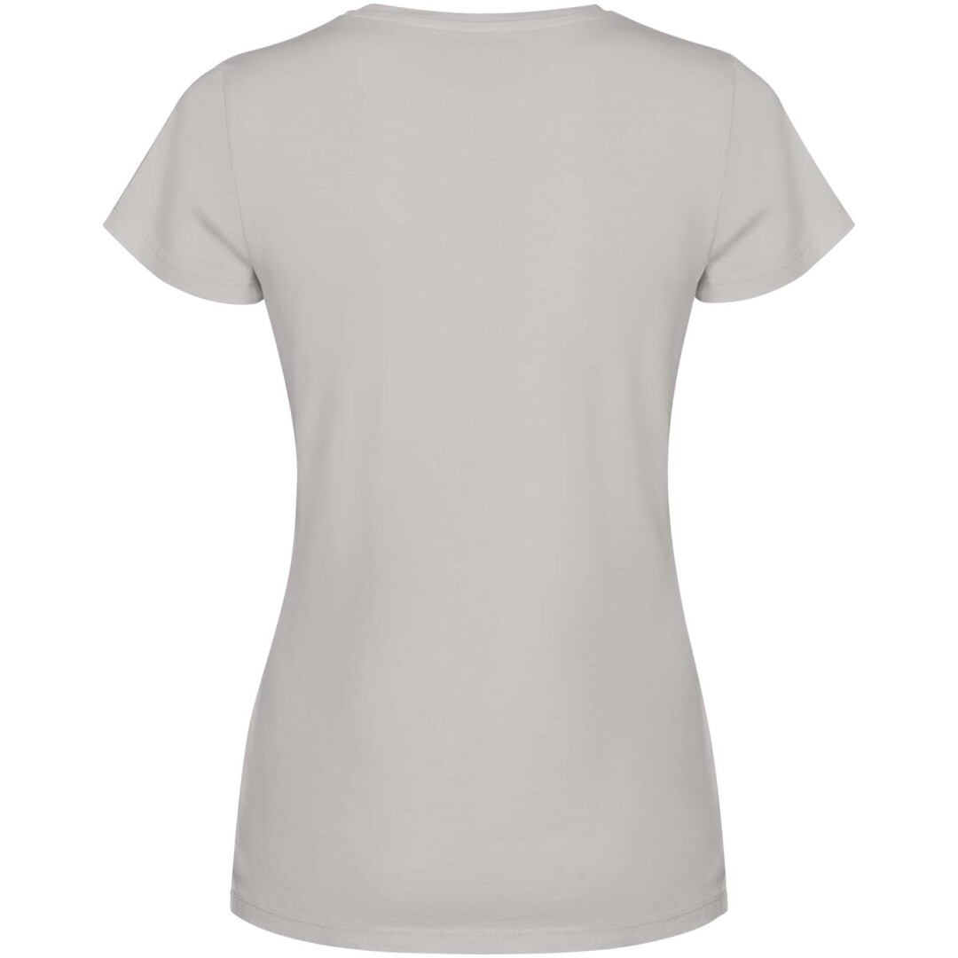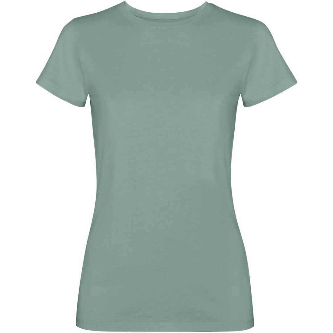 Dámske tričko s krátkym rukávom. Vypraný vzhľad. Rebrovaný okrúhly výstrih 1 × 1 a bočné švy. Krycí steh v tóne látky pri krku.