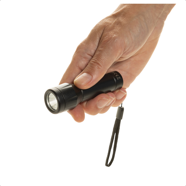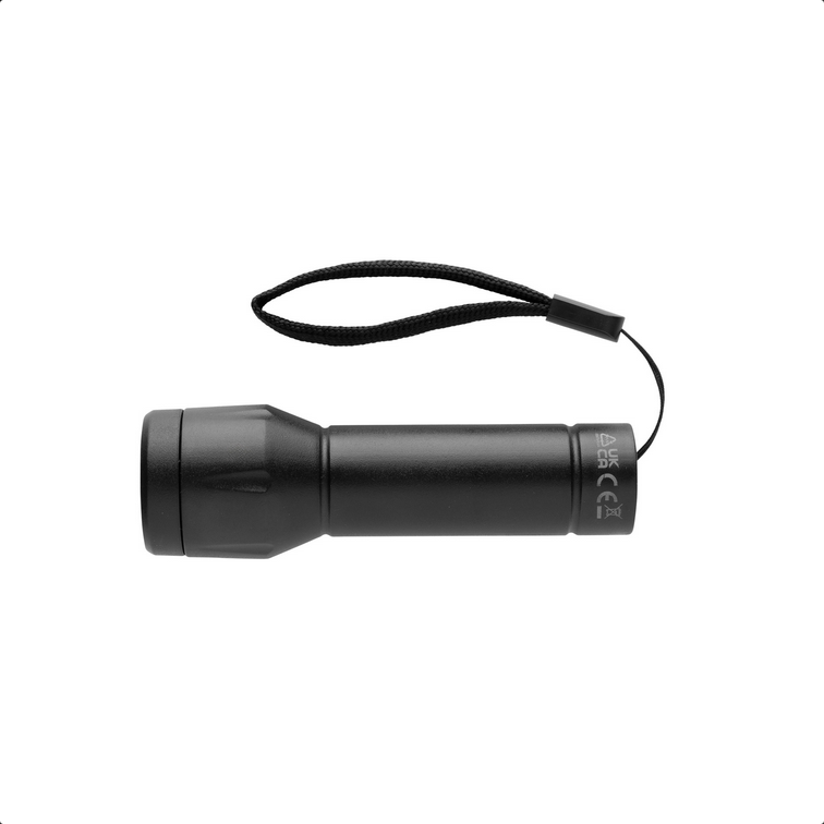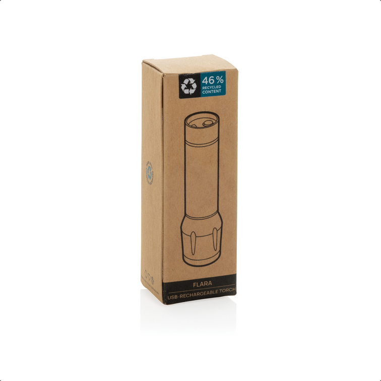 Flara je kompaktné a spoľahlivé svietidlo pre každodenné použitie. Matné čierne telo z 46 % recyklovaného ABS (RCS) ukrýva dobíjateľnú 500 mAh Li-ion batériu s výdržou až 6 hodín a dobíjaním za 1 h 40 min cez priložený 30 cm USB-C ↔ USB-C kábel z recyklovaného RTPE. Svietidlo s jednou XPE diódou ponúka tri režimy: 100 %, 50 % a blikanie (80 lm / 1 W). Čierne polyesterové pútko umožňuje jednoduché prenášanie. Vyrobené z recyklovaného ABS (RCS). RCS (Recycled Claim Standard) je štandard na overenie recyklovaného obsahu produktu v rámci celého dodávateľského reťazca. Celkový podiel recyklátu: 46 %. Produkt je bez PVC a balený v FSC® kraftovej krabičke. | Vstup: 5 V / 1 A.
