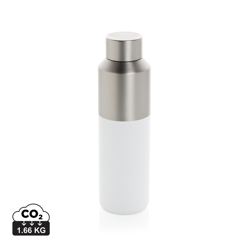 Táto 600ml fľaša na vodu sa vyznačuje jedinečným dvojfarebným štýlovým designom. Dvojstenná vákuová fľaša z recyklovanej nerezovej ocele udrží nápoje chladené až 15 hodín alebo teplé až 5 hodín. Fľaša na vodu sa zmestí do väčšiny štandardných držiakov na nápoje v aute. Vyrobená z certifikovaných recyklovaných materiálov podľa štandardu RCS (Recycled Claim Standard), čo zaisťuje plne certifikovaný dodávateľský reťazec recyklovaných materiálov. Recyklovaný obsah podľa celkovej váhy produktu: 95%. Bez BPA. Zahŕňa darčekové balenie z kraftového papiera s certifikáciou FSC®.