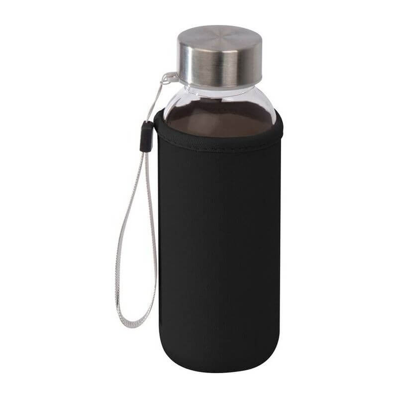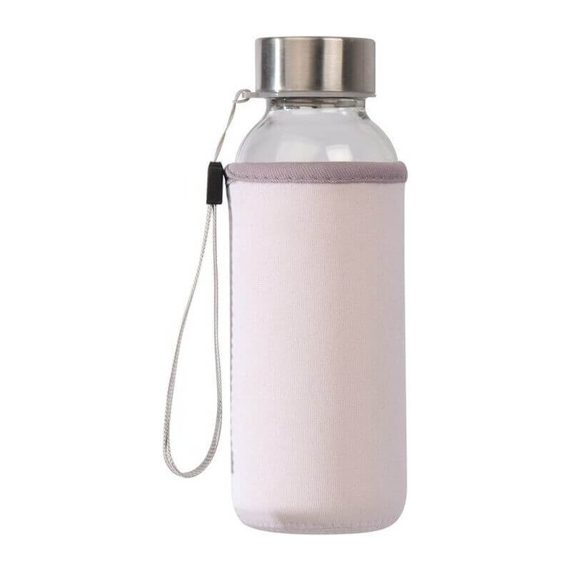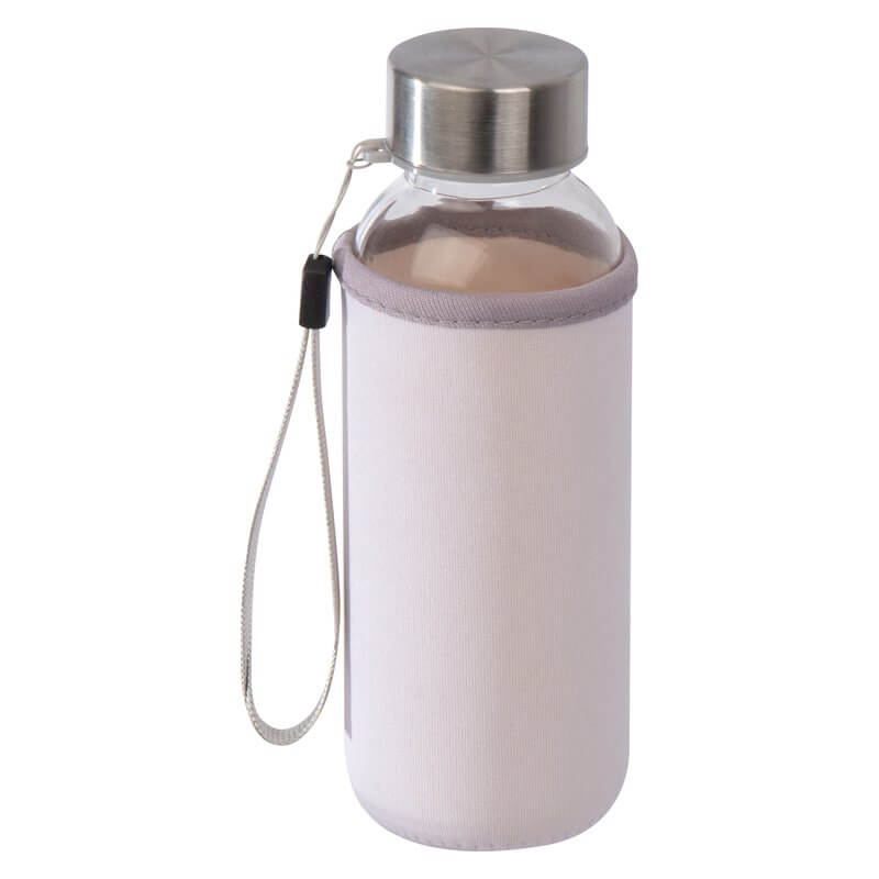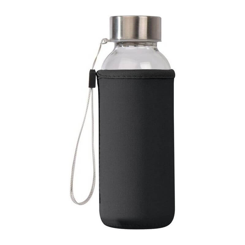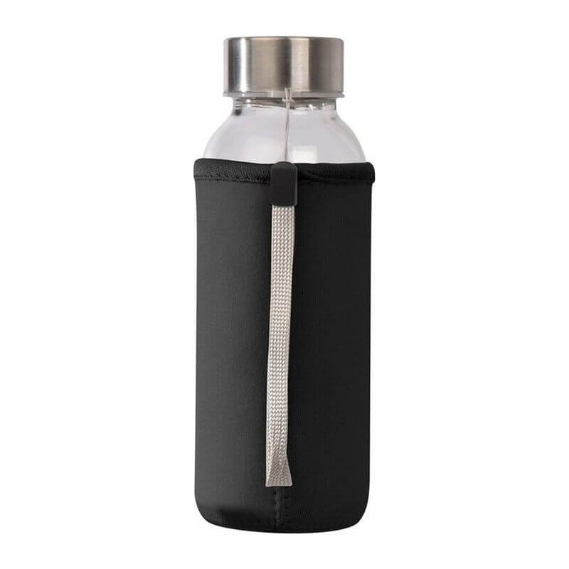 Priehľadná plastová fľaša na pitie s neoprénovým puzdrom, pútkom na zápästie a objemom 300 ml. Spôsob potlače sieťotlač.