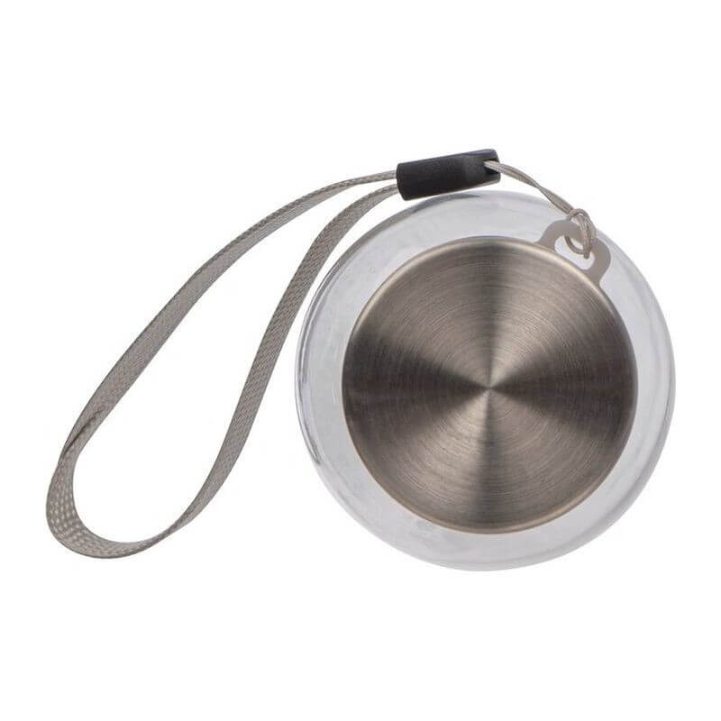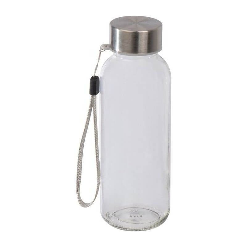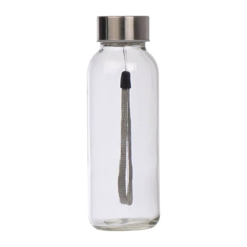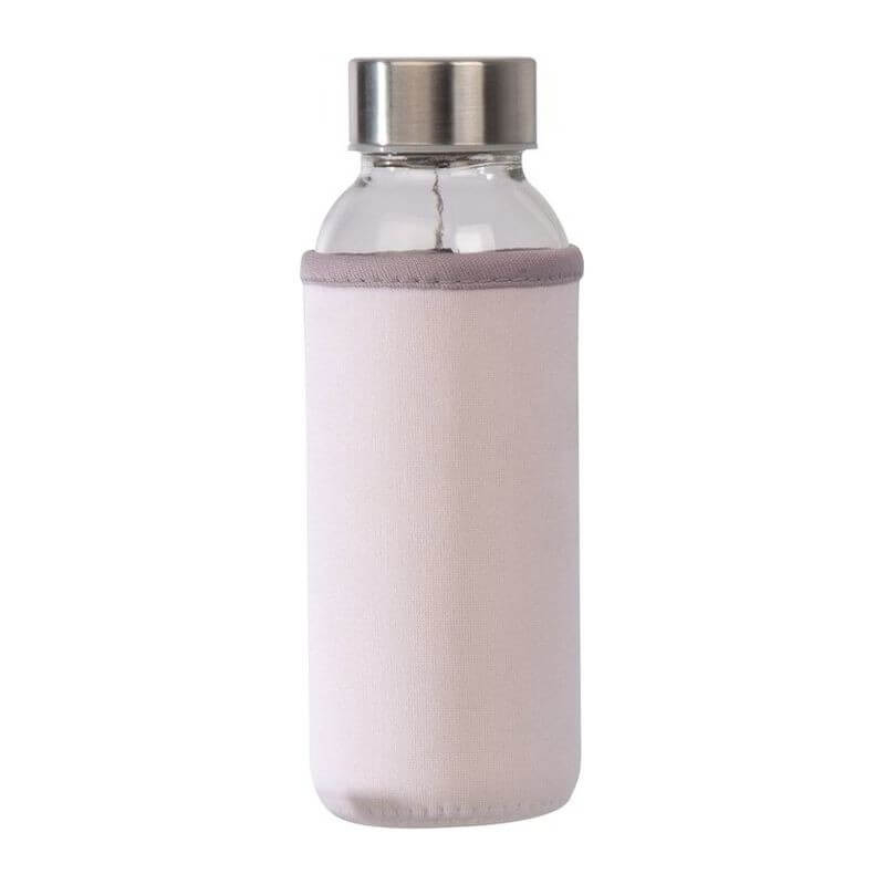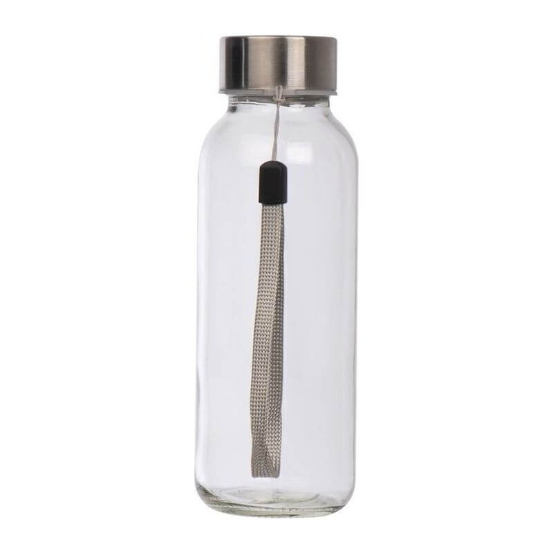 Priehľadná plastová fľaša na pitie s neoprénovým puzdrom, pútkom na zápästie a objemom 300 ml. Spôsob potlače sieťotlač.