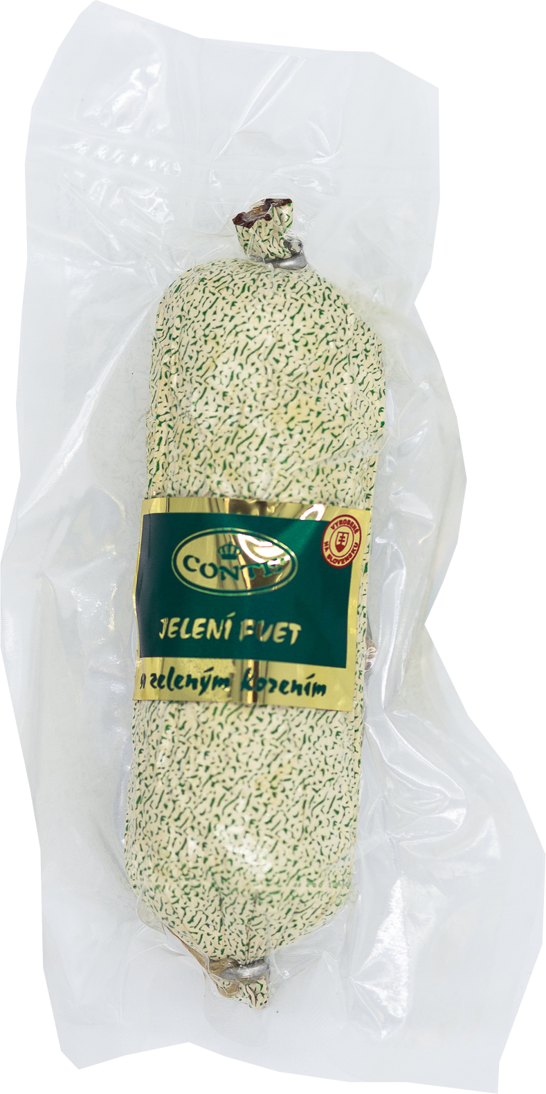 FUET zo zeleným korením – trvanlivá, sušená saláma z 43 % jelenieho, 35 % bravčového mäsa a 20 % bravčovej slaniny, dochutená zmesou prírodných korenín a jedlou soľou. Bez tepelného spracovania, sušená 21 dní, vákuovo balená (205–220 g).