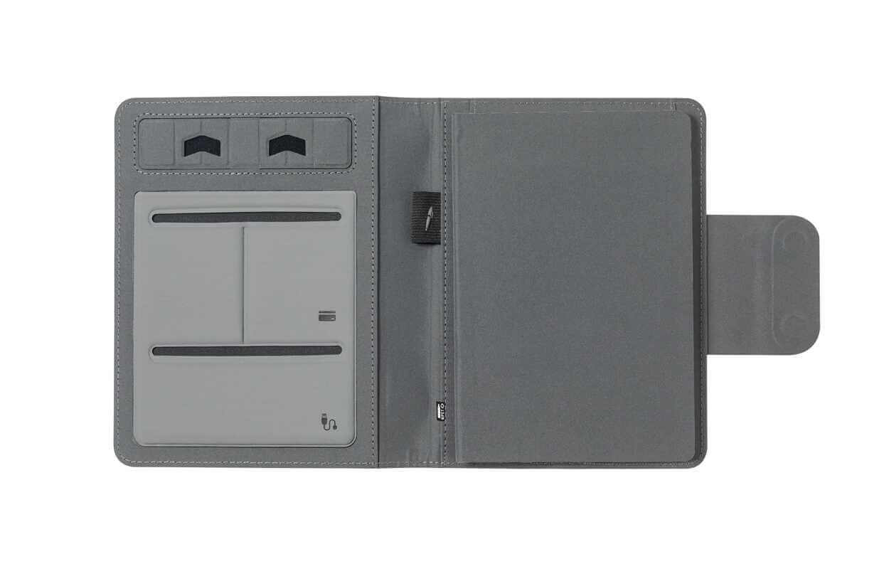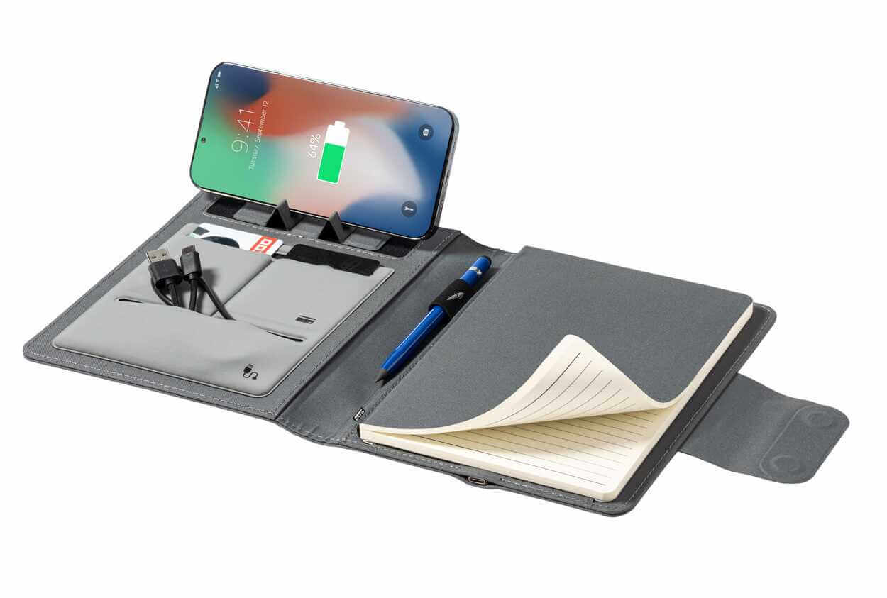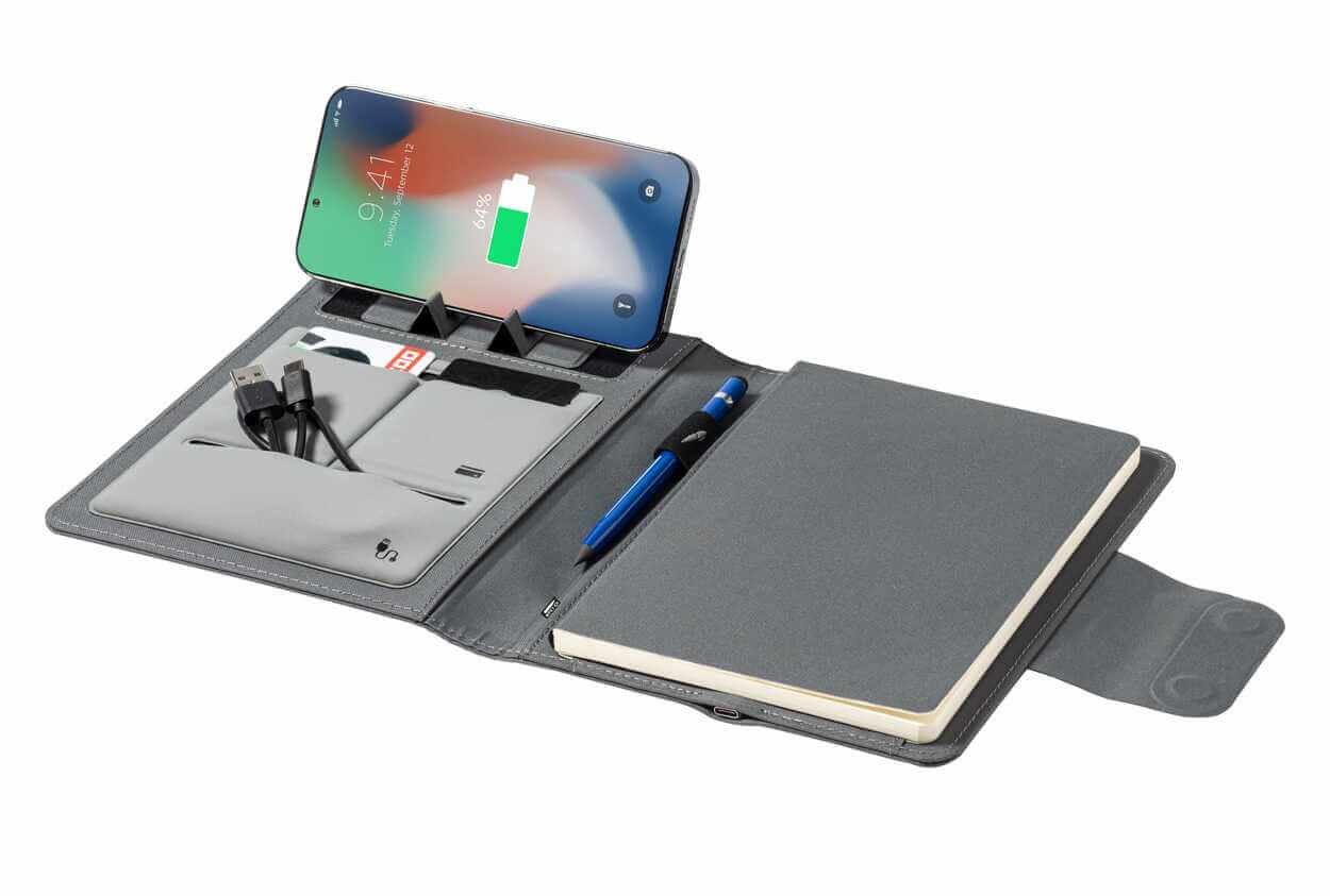 Polyesterová zložka na dokumenty A5 z 300D RPET so zápisníkom na 65 riadkov, vstavanou magnetickou bezdrôtovou rýchlonabíjačkou (10W), power bankou 5000 mAh s portom na nabíjanie USB a skladacím držiakom na mobil. Vrátane samolepiaceho kovového krúžku na použitie magnetickej funkcie na akomkoľvek bezdrôtovo nabíjacom zariadení.