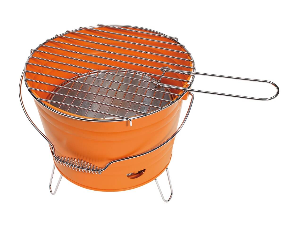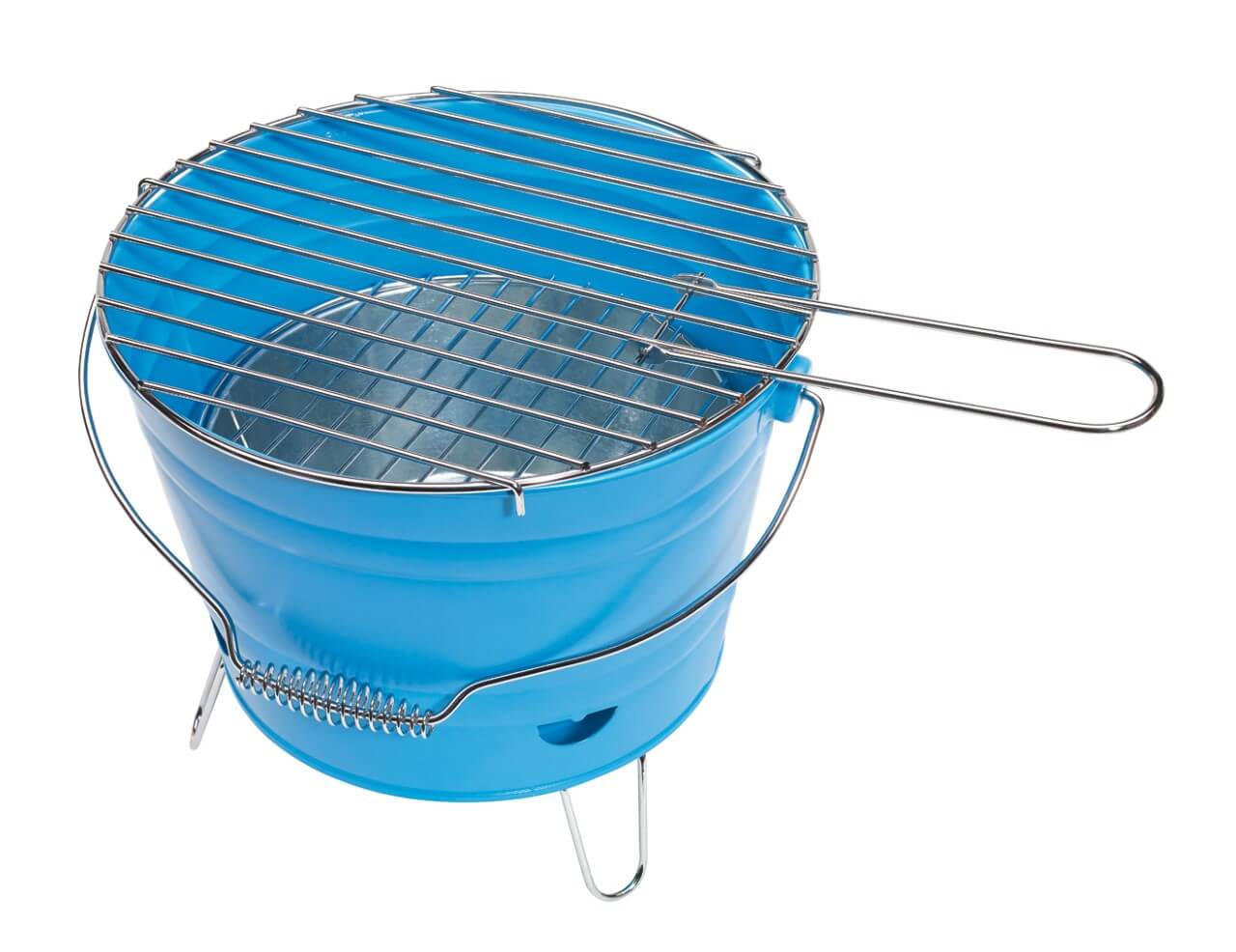 Grill "Bucket": veľký rošt s rozkladacou rukoväťou, 1 dodatočný malý rošť, odnímateľný zásobník na uhlie, 4 vetracie otvory, 3 rozkladacie kovové nožičky na spodnej strane