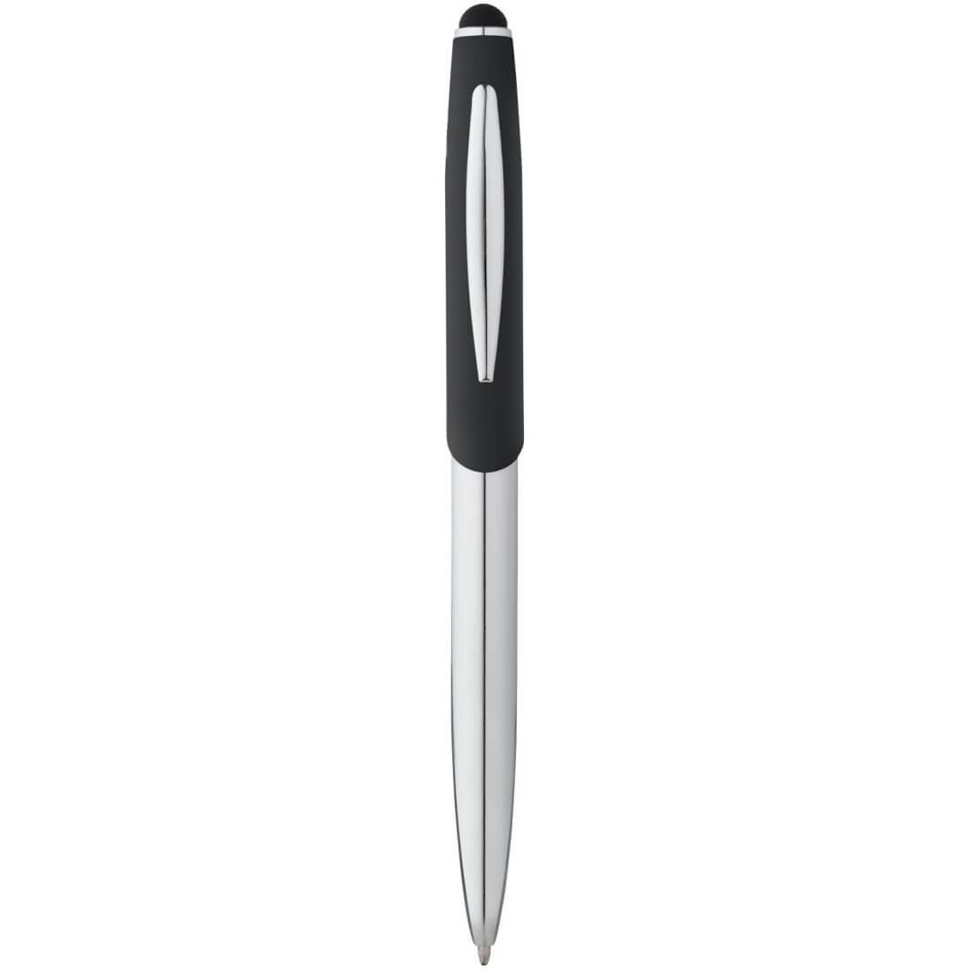 Guľôčkové pero a stylus Geneva. Guľôčkové pero a stylus má vycibrený tvar s matným povrchom horného dielu a lesklým chrómovaným povrchom spodného dielu, so zhodnými akcenty chrómovaných doplnkov. Vrátane zamatového vačku. Balené v Avenue darčekovej kazete (veľ .: 16 x 2,5 x 1,5 cm). Kov.