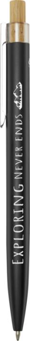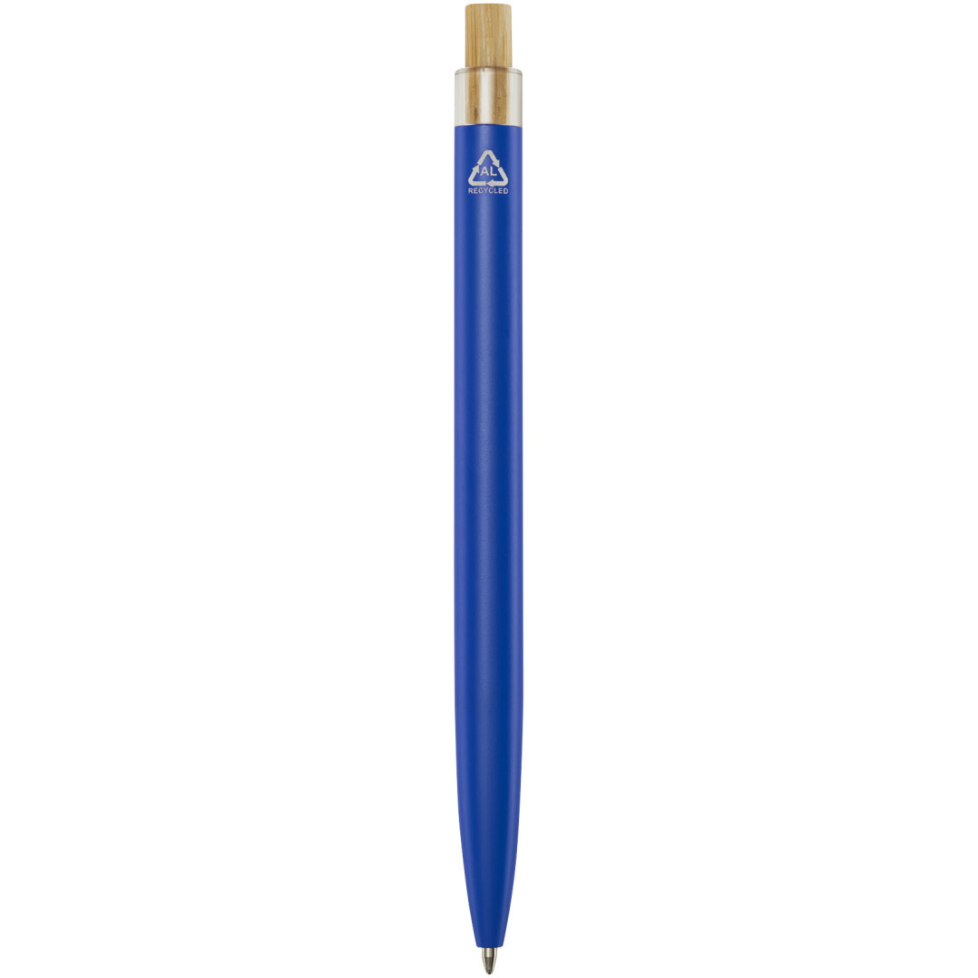 Guľôčkové pero Nooshin je vyrobené z recyklovaného hliníka, čo si vyžaduje menej energie ako výroba hliníka z nerastných surovín. Znižuje tiež množstvo odpadu na skládkach a pomáha šetriť prírodné zdroje s cieľom znížiť emisie skleníkových plynov. Tlačidlo je vyrobené z bambusu. Farba atramentu: Modrá. Dĺžka písania: 800 metrov. Rozmer hrotu: 1,00 mm.