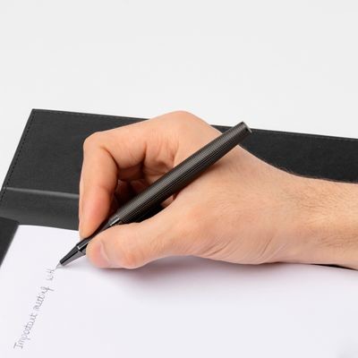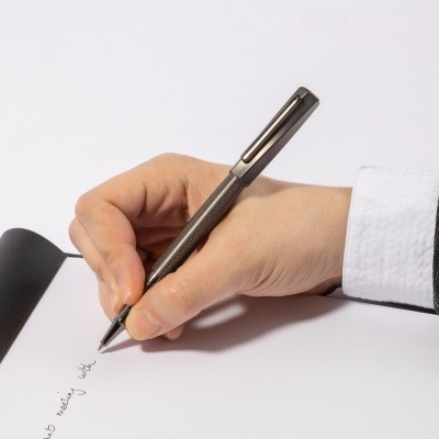 Guľôčkové roller pero Twist má pevný a technický dizajn. Tento písací kus obsahuje sofistikovanú skrútenú čiapočku z tmavého chrómu a telo s vyrytým mriežkovým vzorom pre moderný dojem, ktorý mu dodáva kontrastnú siluetu.