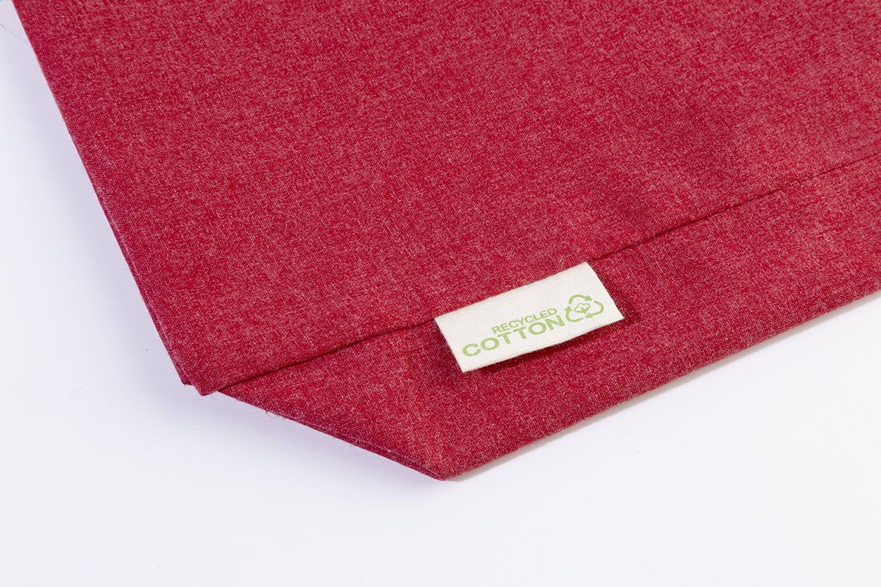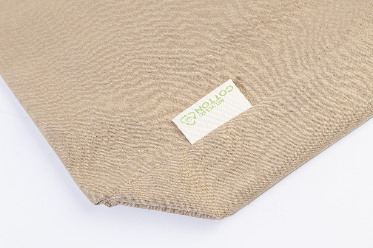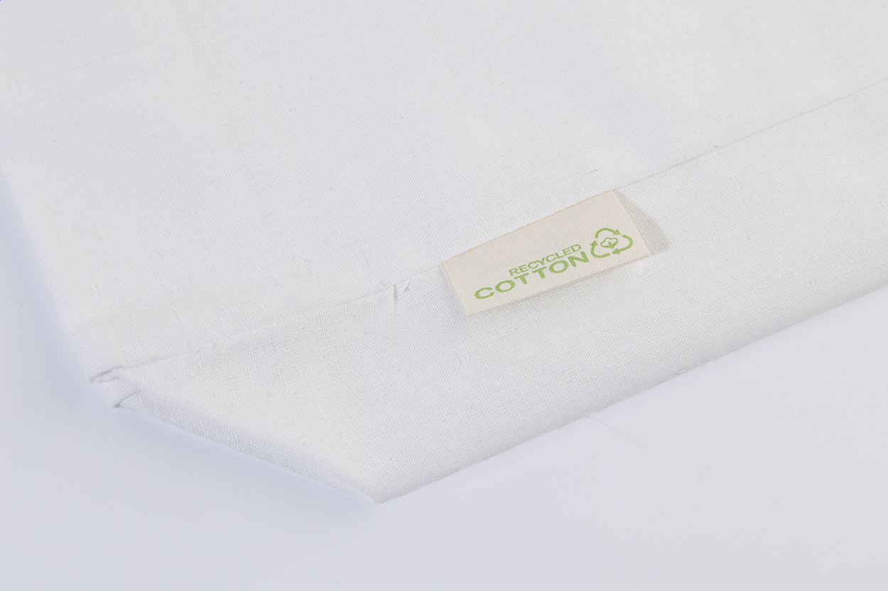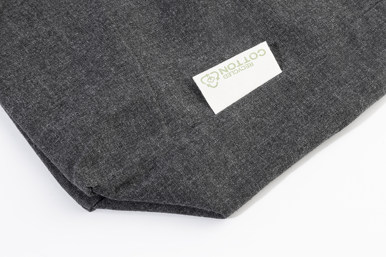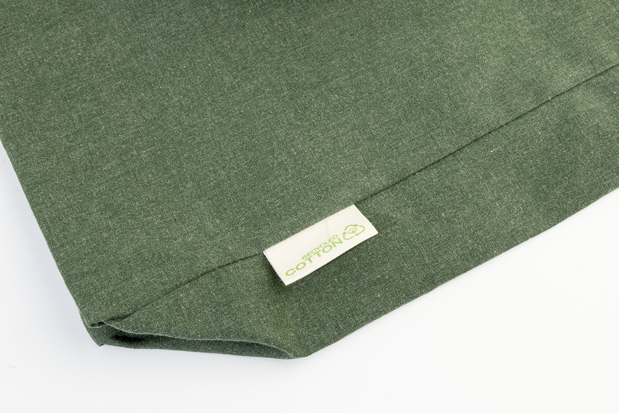 Nákupná taška s klinom a dlhými ušami zo 70% recyklovanej bavlny a 30% RPET polyesteru, 140 g/m². S výraznou etiketou o recyklovanej bavlne. New. Go Green. Material 2 weight: 140 g/m2